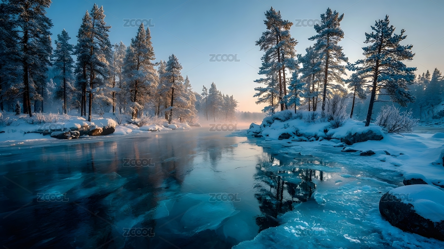 树木,宁静,自然,风景,冷色调,冬天,森林,阳光,静谧,河流