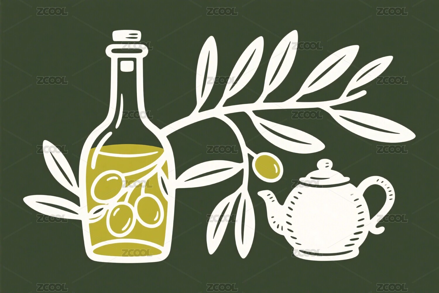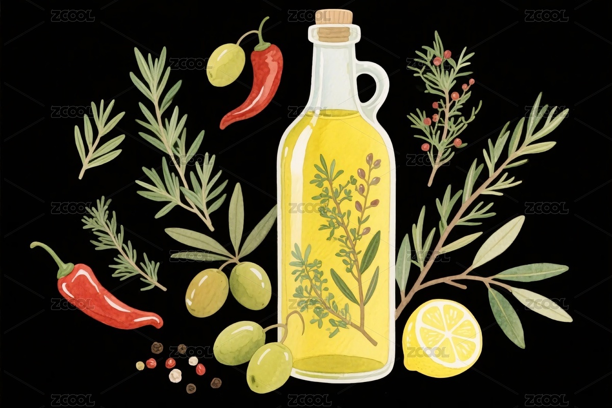 橄榄油,瓶子,橄榄,红辣椒,柠檬,迷迭香,香料,插画,食材,画面元素