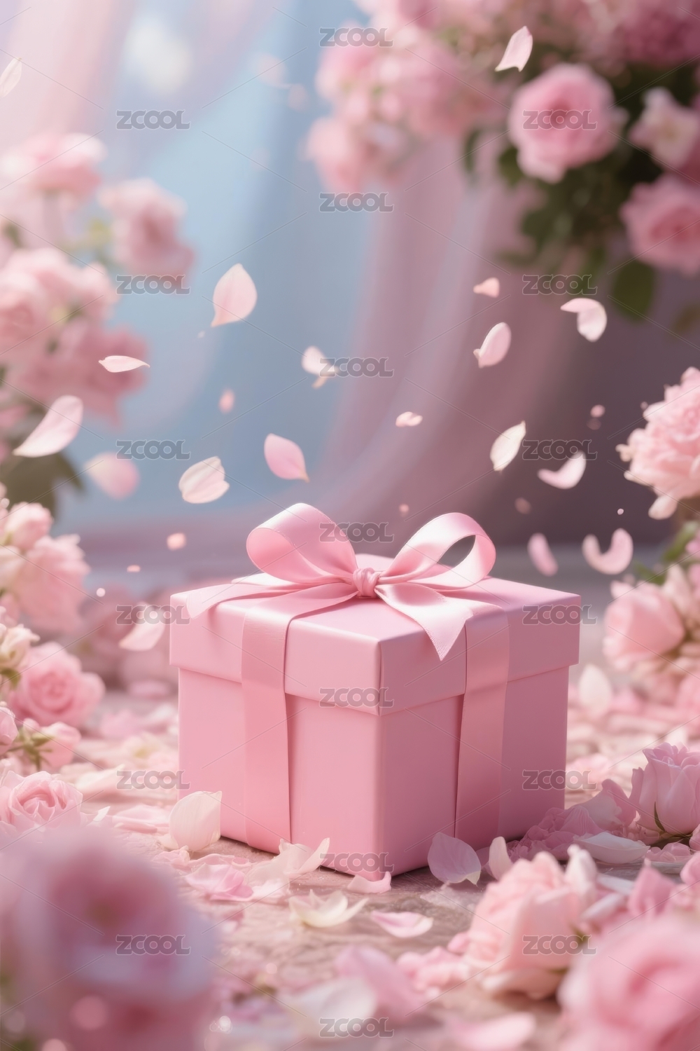 粉色玫瑰花束置于礼盒中背景樱花盛开