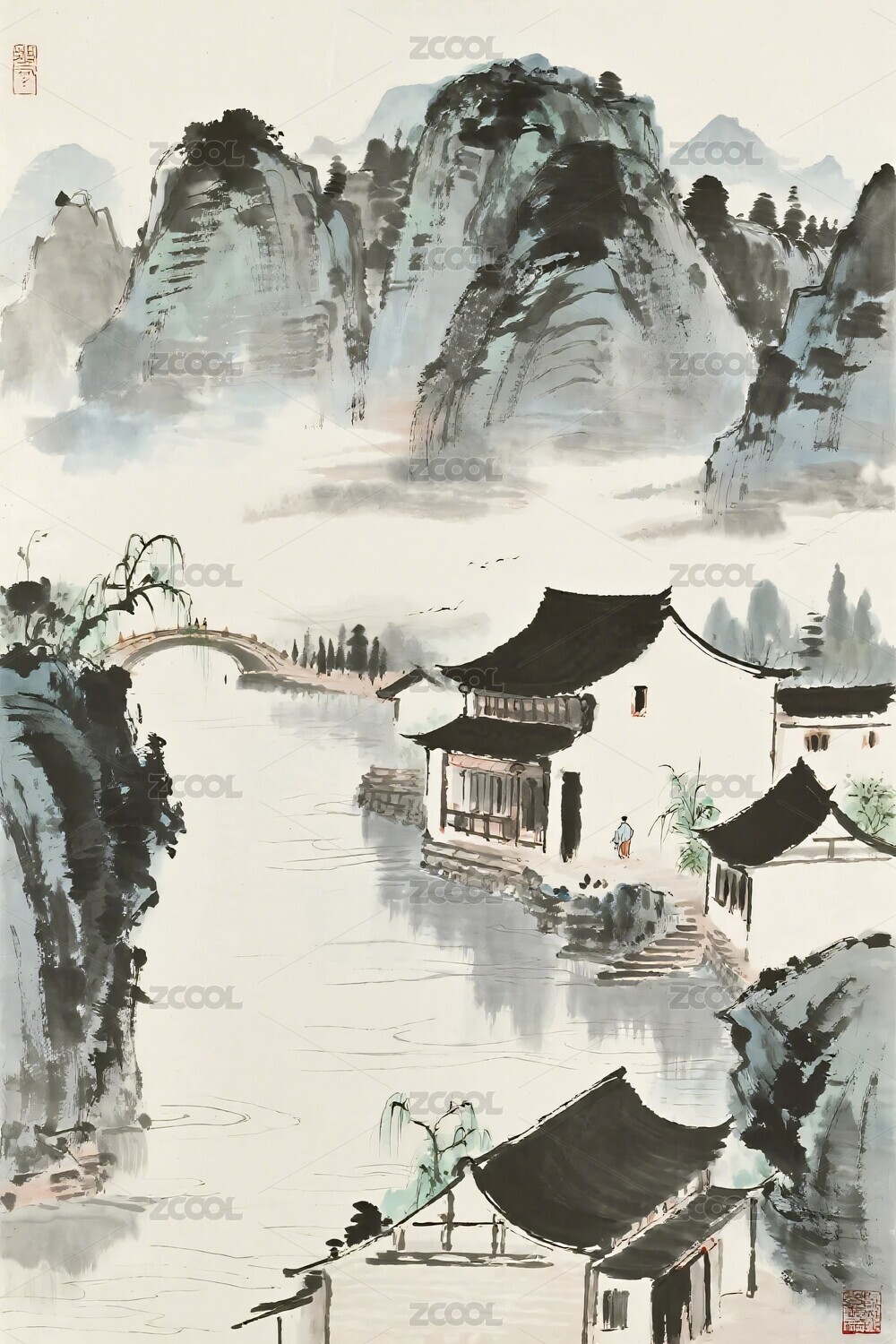 山水,古建筑,小船,人物,水墨画,插画,中国风,传统,风景,雾气