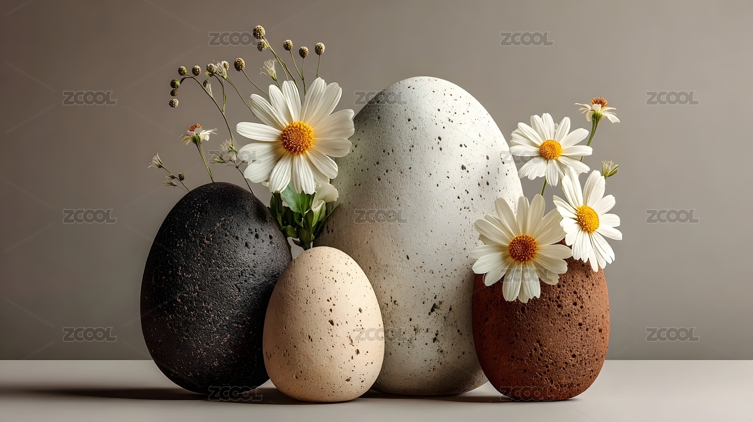 雏菊花与鹅卵石的静谧组合