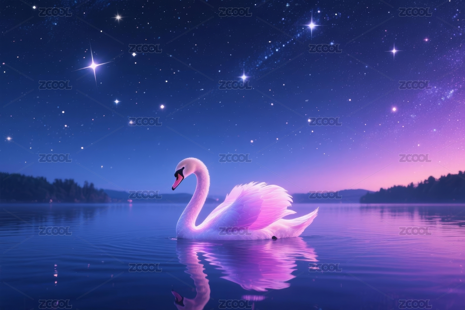 蓝色,紫色,背景,天鹅,宁静,湖面,星空,树木,轮廓,夜晚