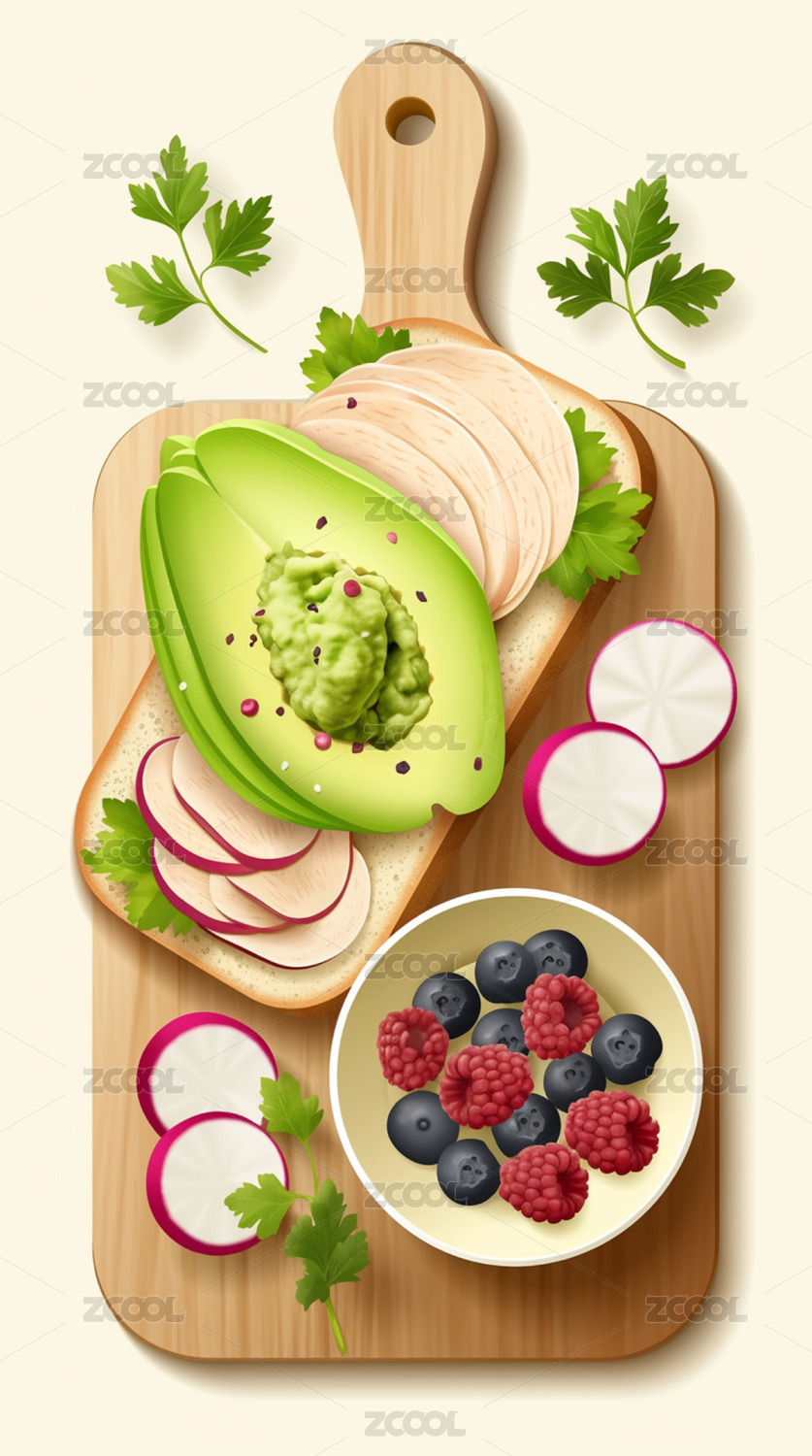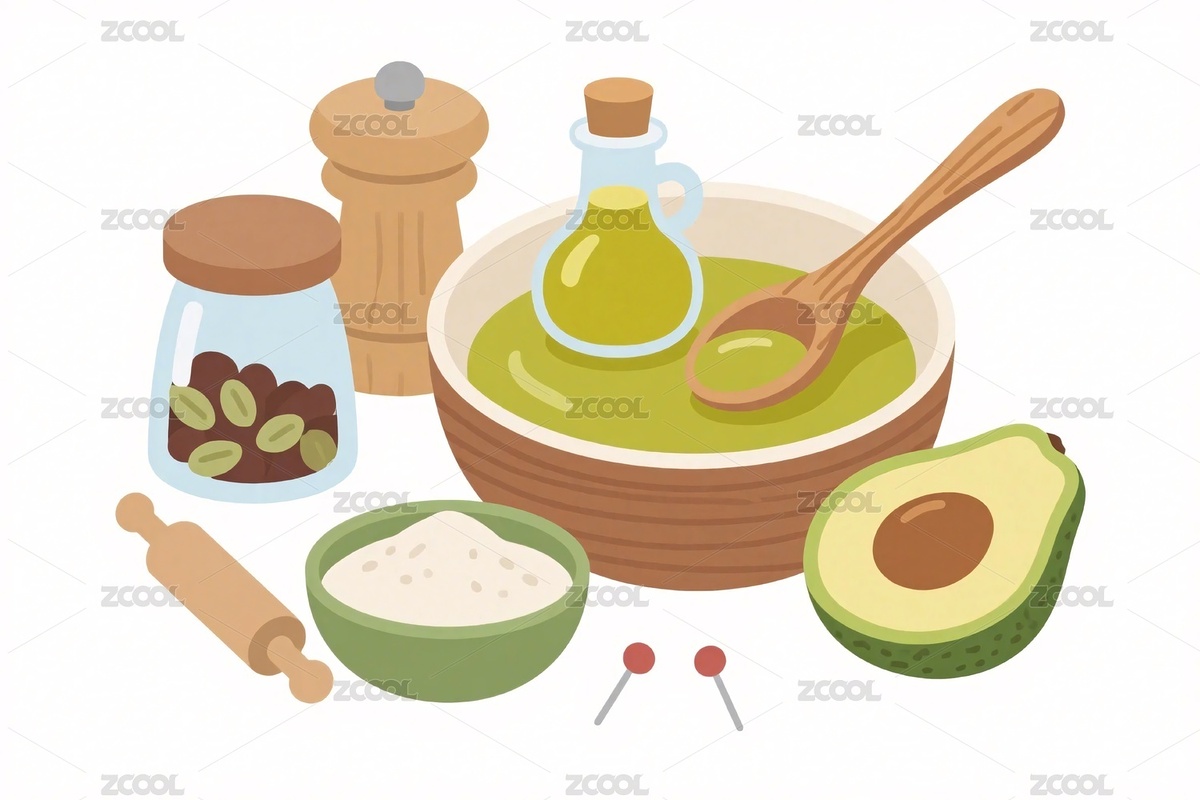 插画,厨房,食材,调料,橄榄油,牛油果,面粉,坚果,擀面杖,木碗