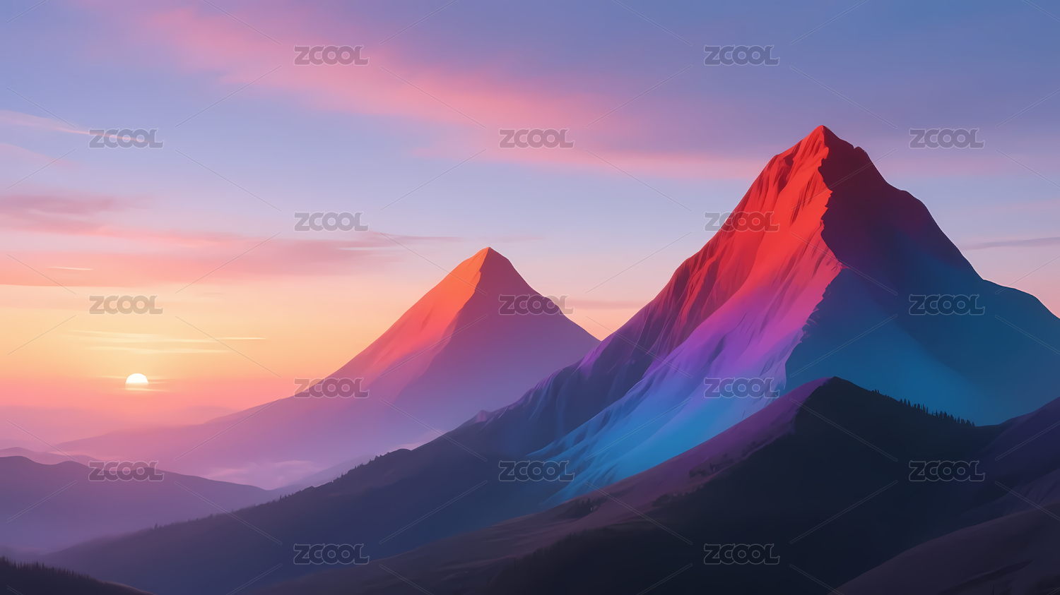红蓝山峰映衬紫粉天空