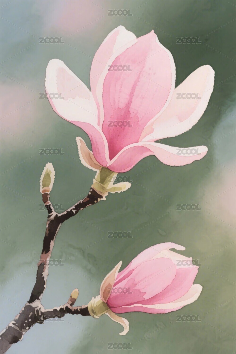 玉兰花,花朵,花苞,枝干,花卉,插画,水彩,植物,柔美,艺术