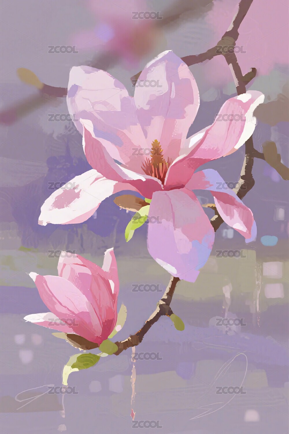 玉兰,花朵,枝条,粉色,插画,柔和,装饰,花卉,艺术,国画风