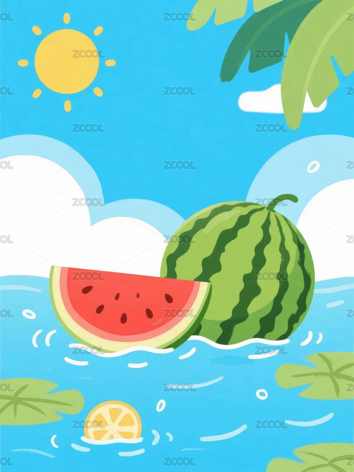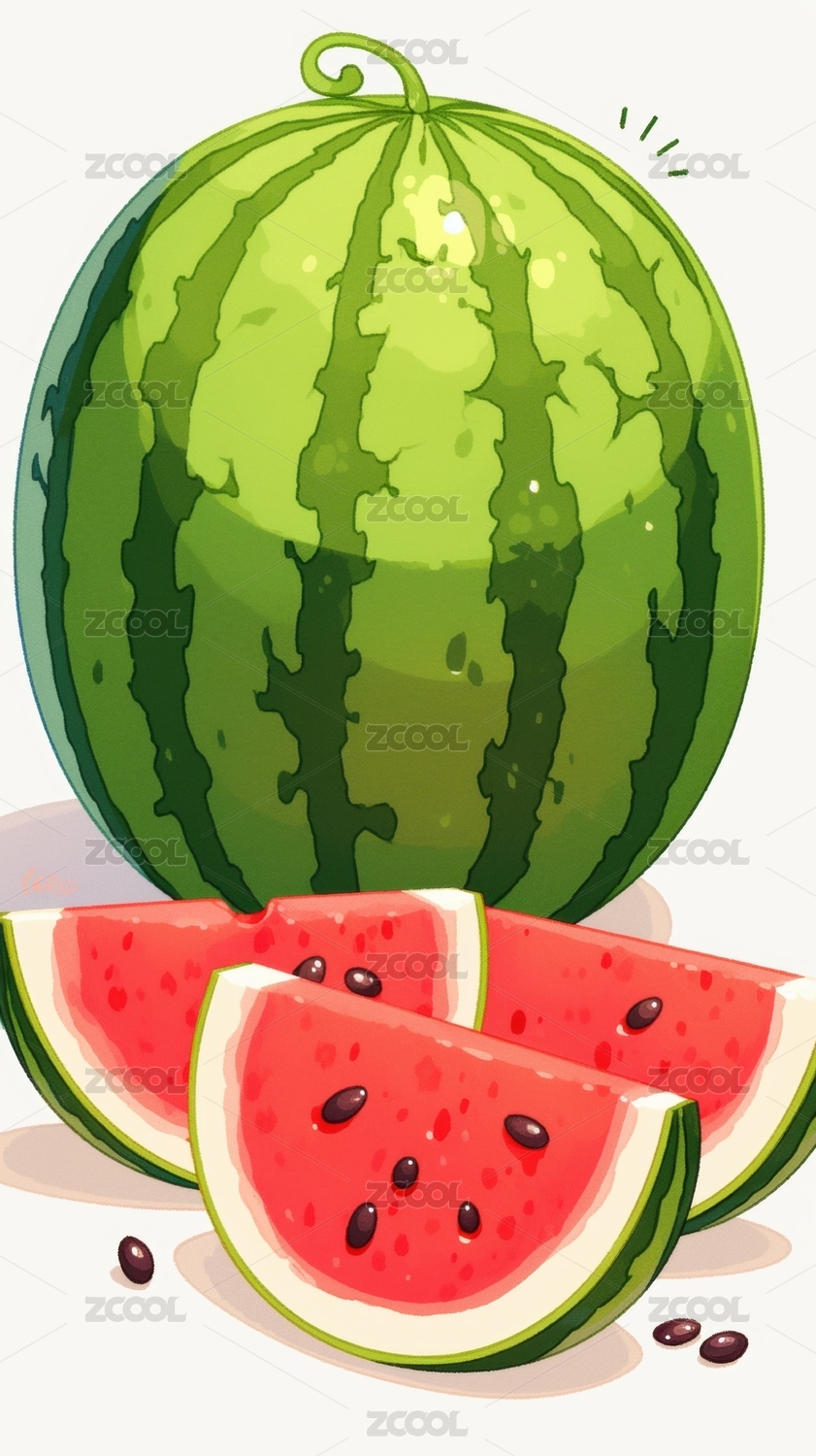 西瓜,瓜藤,绿叶,水珠,圆润,青皮,条纹,夏日,清爽,果香