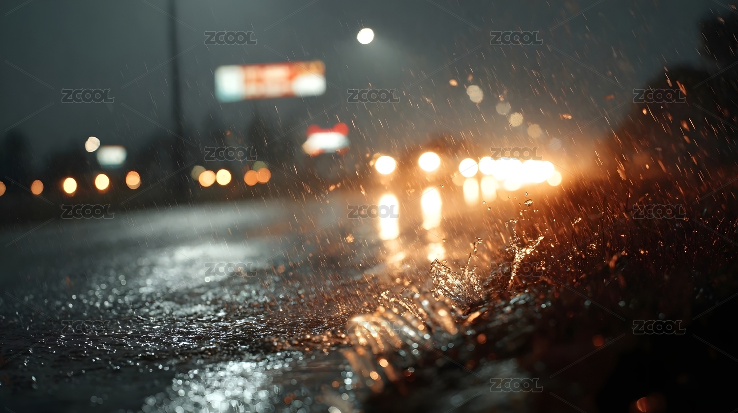 夜雨,街道,积水,车灯,路灯,湿路,倒影,朦胧,城市,静谧