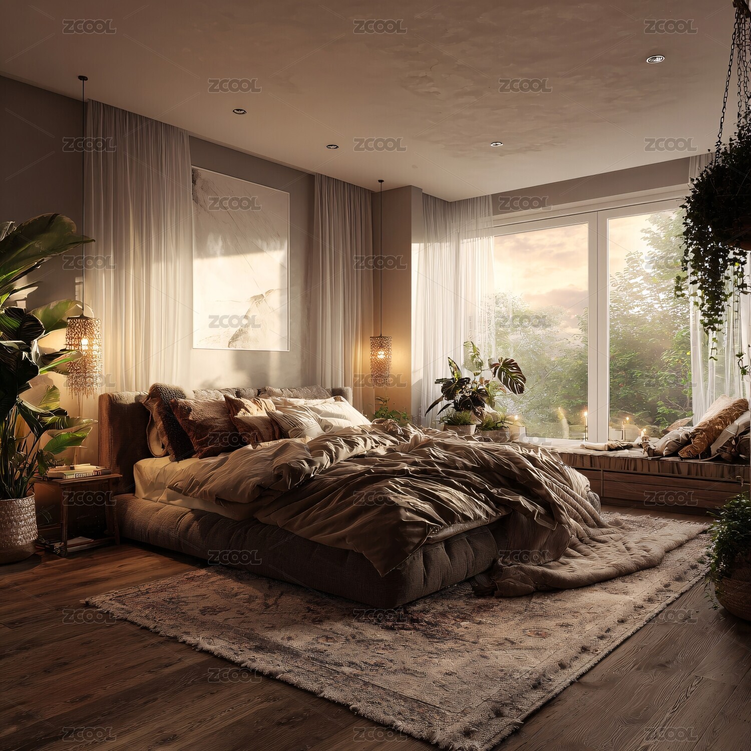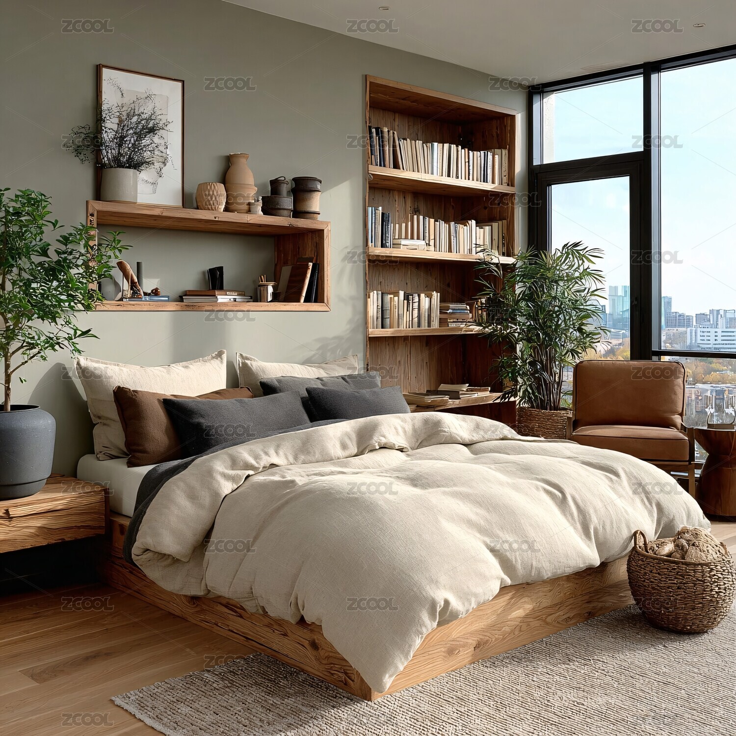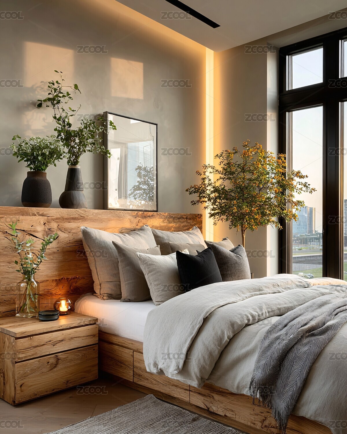 卧室,枕头,被子,床头柜,绿植,窗户,简约风格,温馨,室内,家居