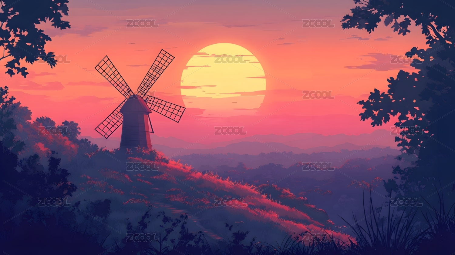 宁静夜晚中的风车与落日