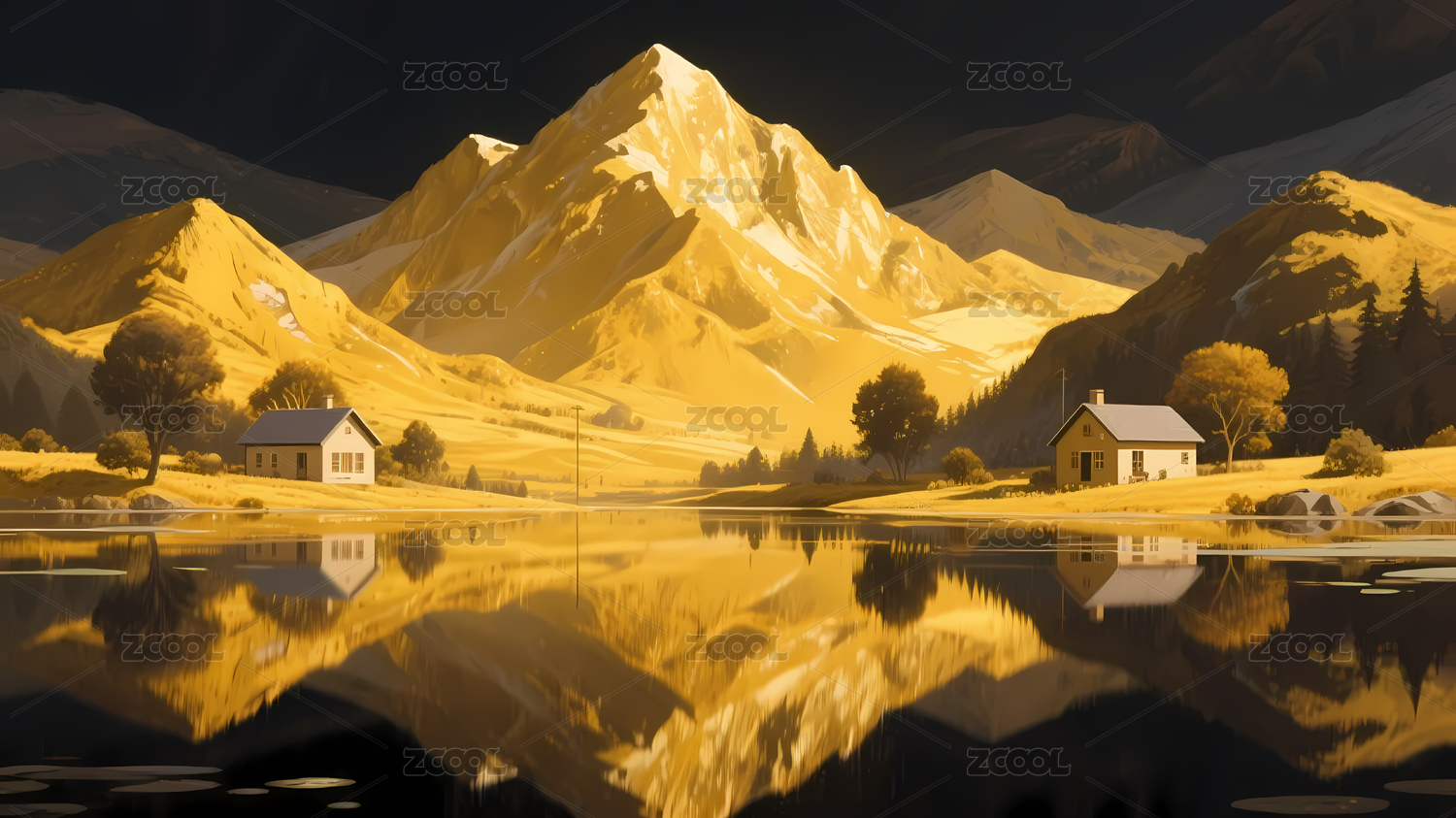 金色,天空,自然,渐变,宁静,山脉,湖水,倒影,小屋,树木