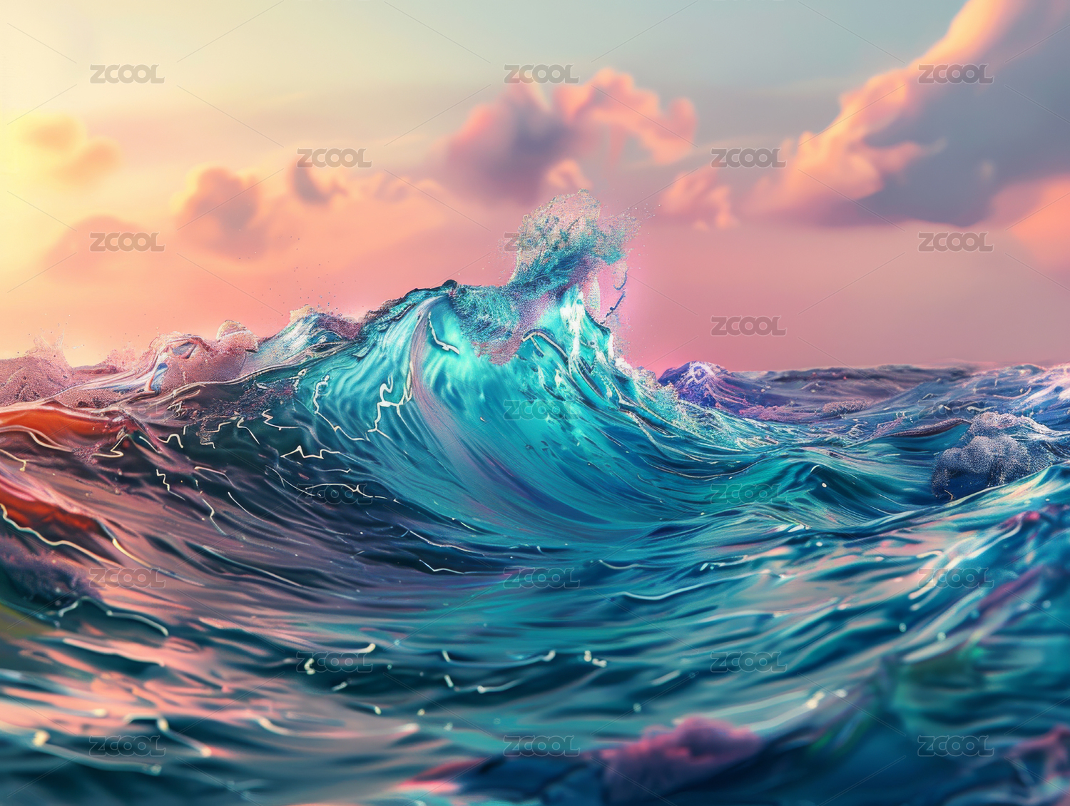 彩虹色海浪在夕阳下的闪耀瞬间