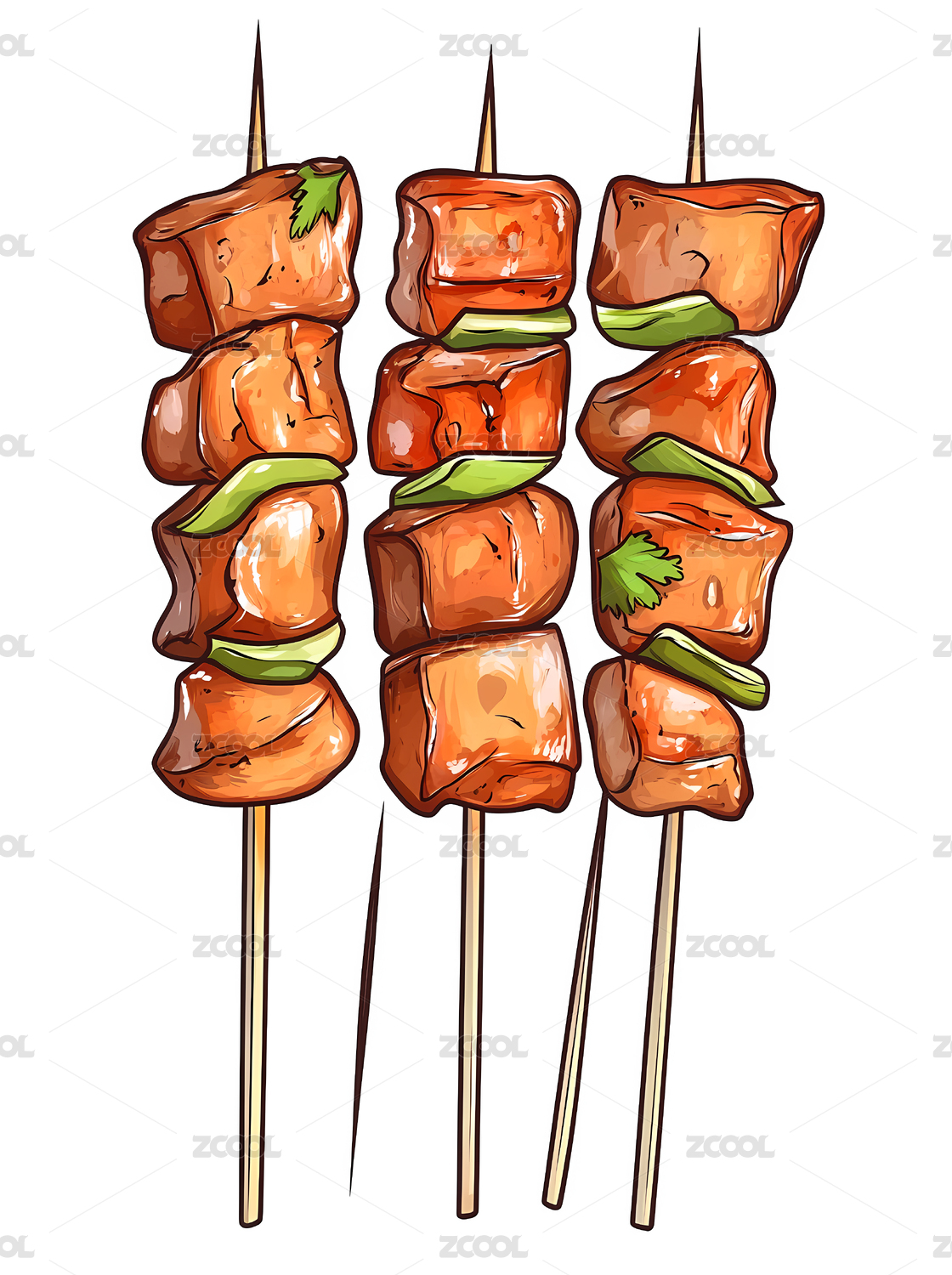 鱿鱼,烤串,三串,插画,美食,海鲜,手绘,美味,烧烤,葱花