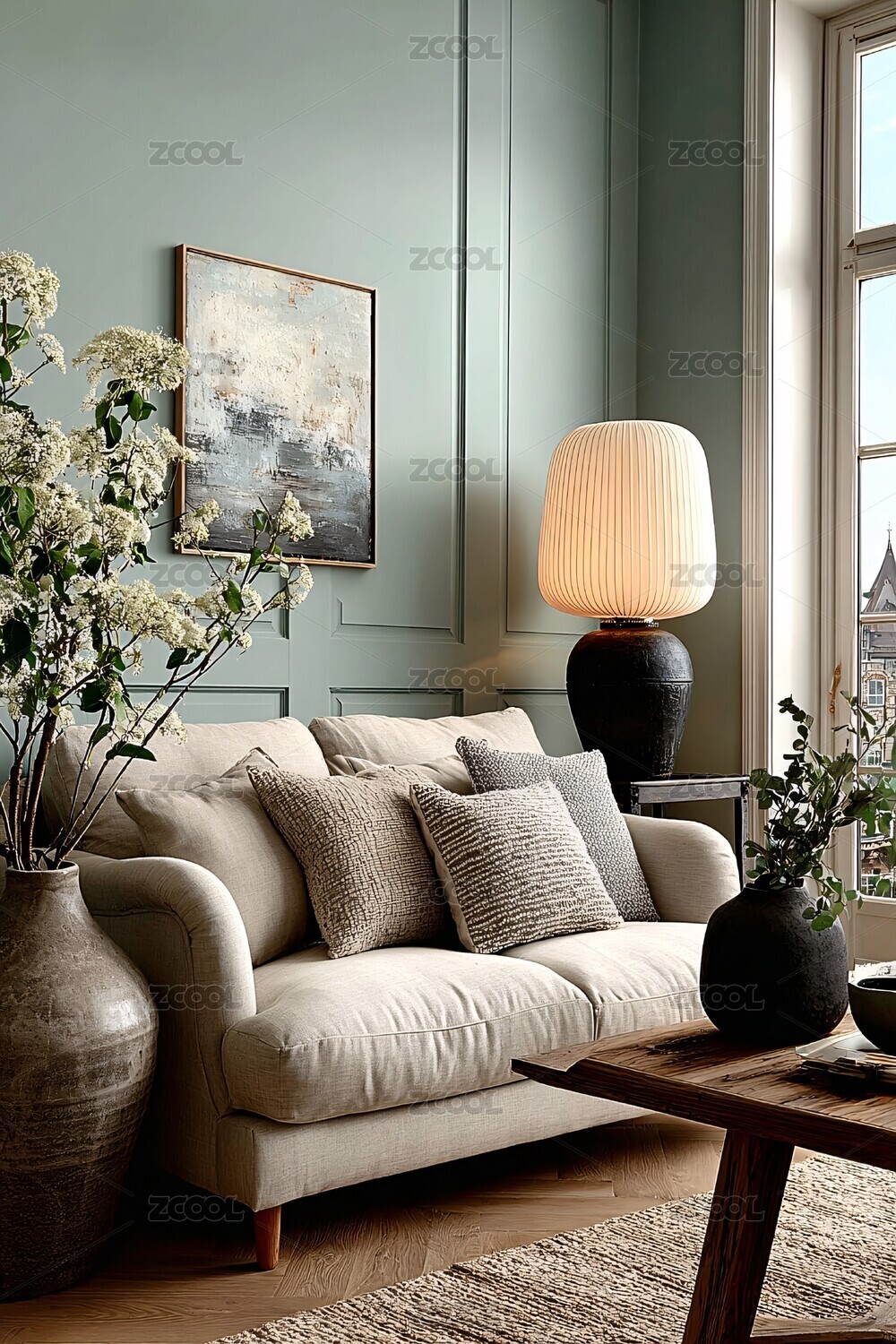 客厅,沙发,茶几,书架,装饰画,植物,抱枕,室内场景,家居,现代风格