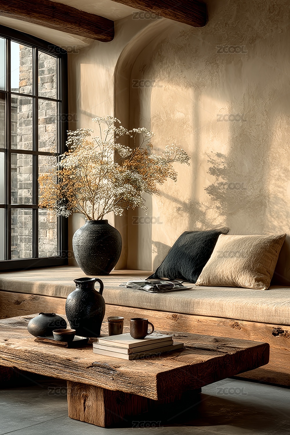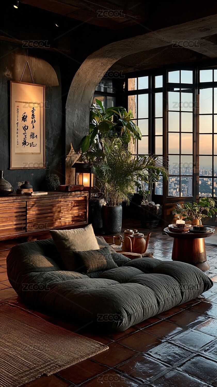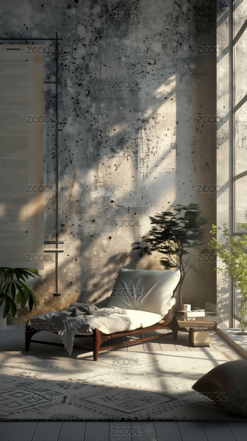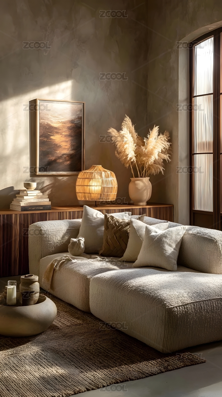 室内场景,沙发,抱枕,绿植,墙面,复古风,光影,窗户,灯具,装饰画
