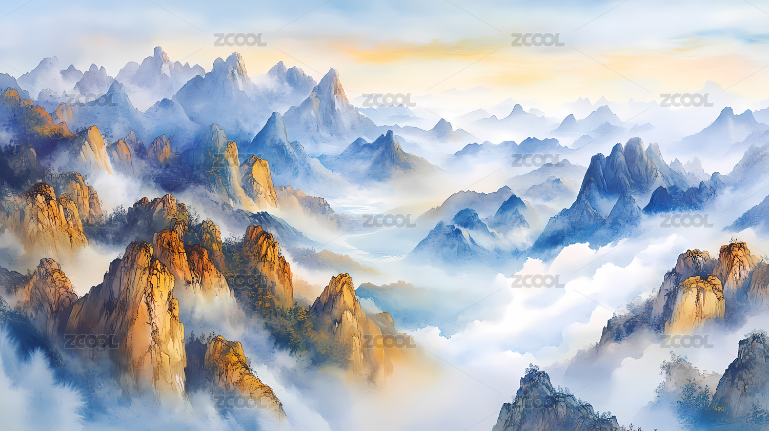 水墨画,国潮,风景,高山,树木,植物,云雾,古风,写意,天空