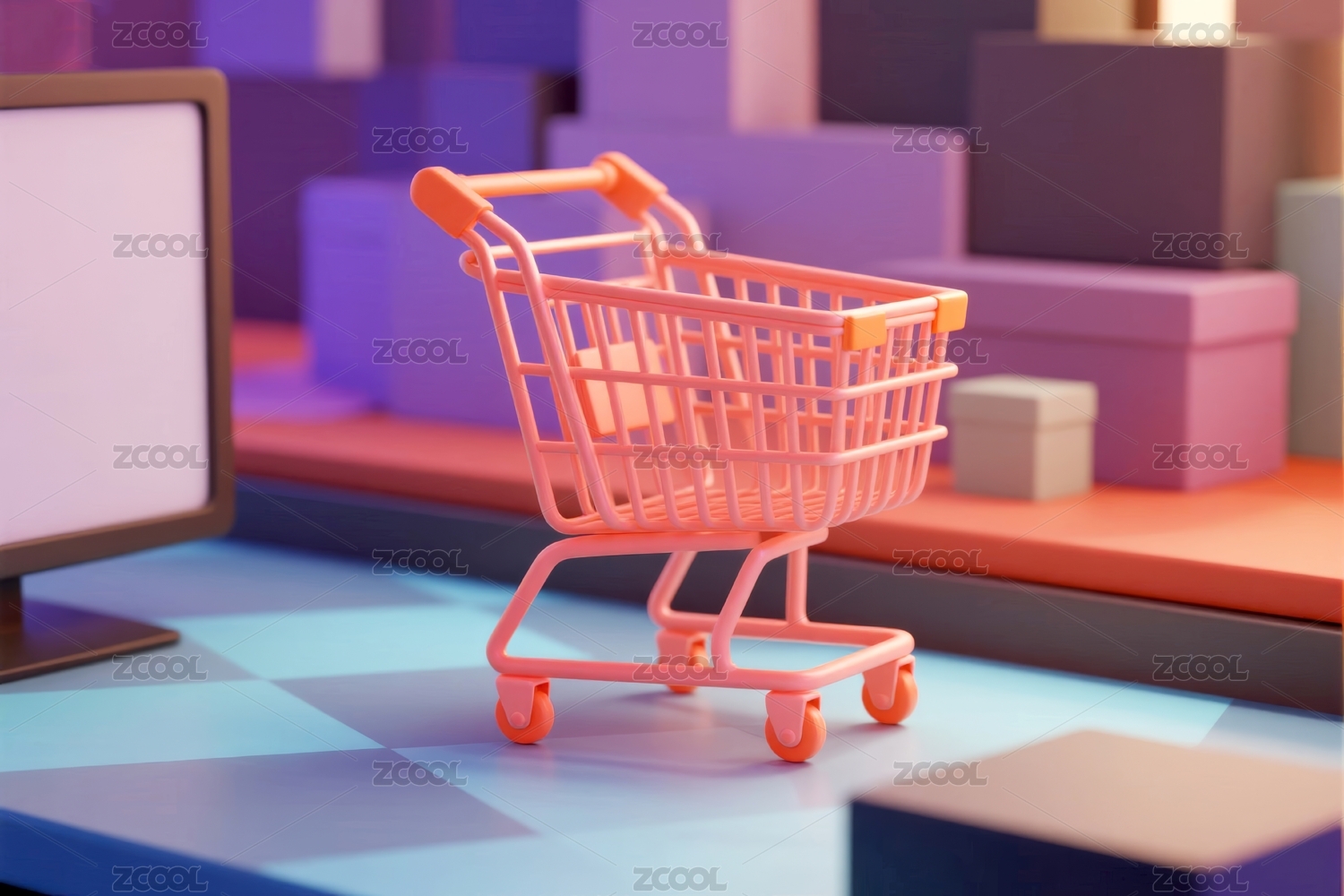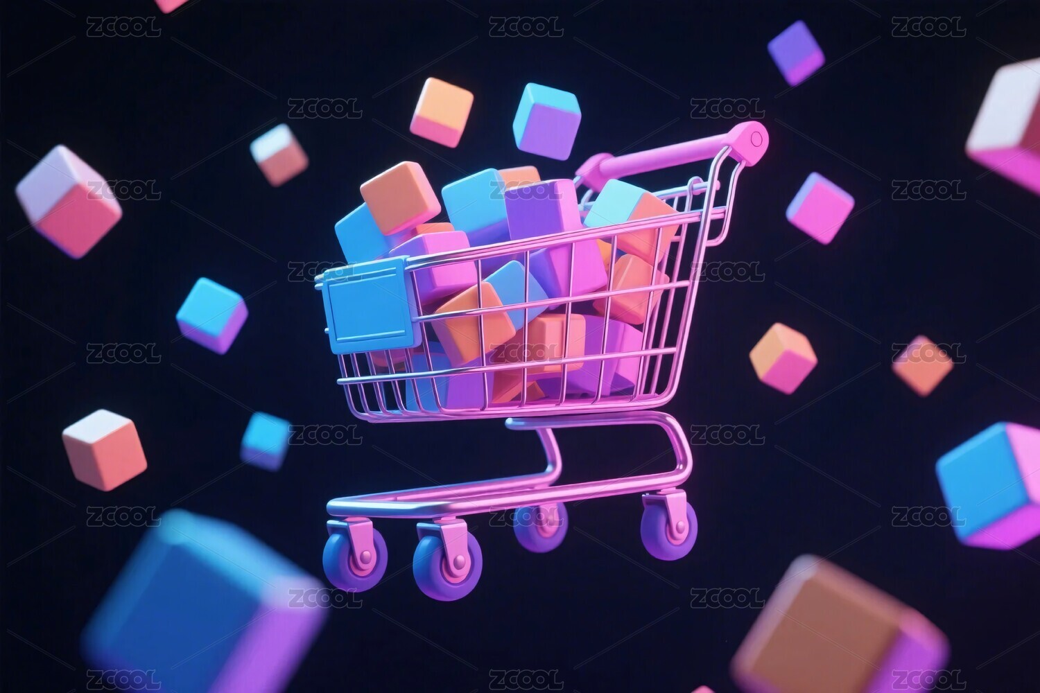 购物车,彩色,方块,插画,悬浮,购物,零售,促销,立方体,商业