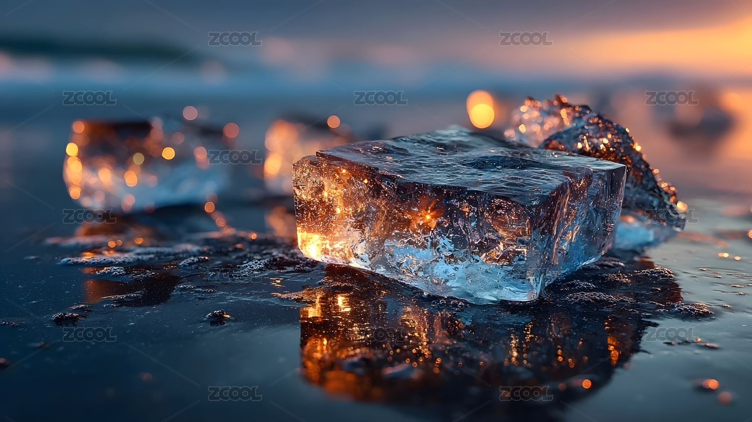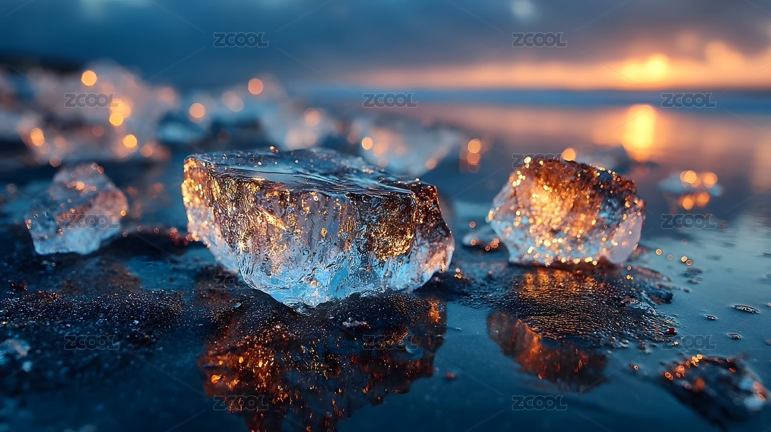 山脉,自然,冰面,冰块,夕阳,湖面,冰晶,倒影,风景,寒冷