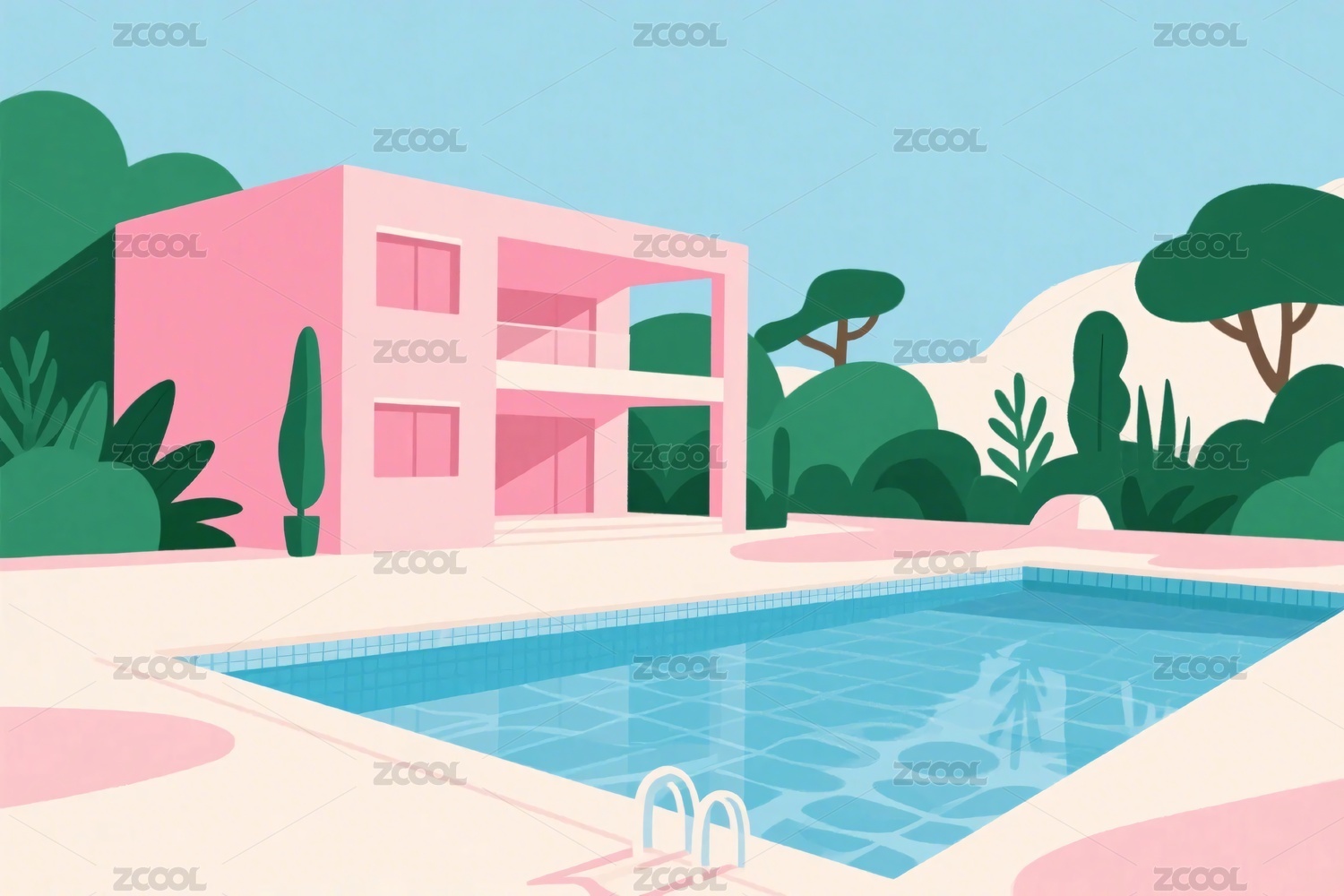 泳池,躺椅,住宅,棕榈树,花园,现代,休闲,粉色,蓝色,插画