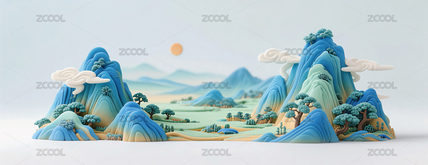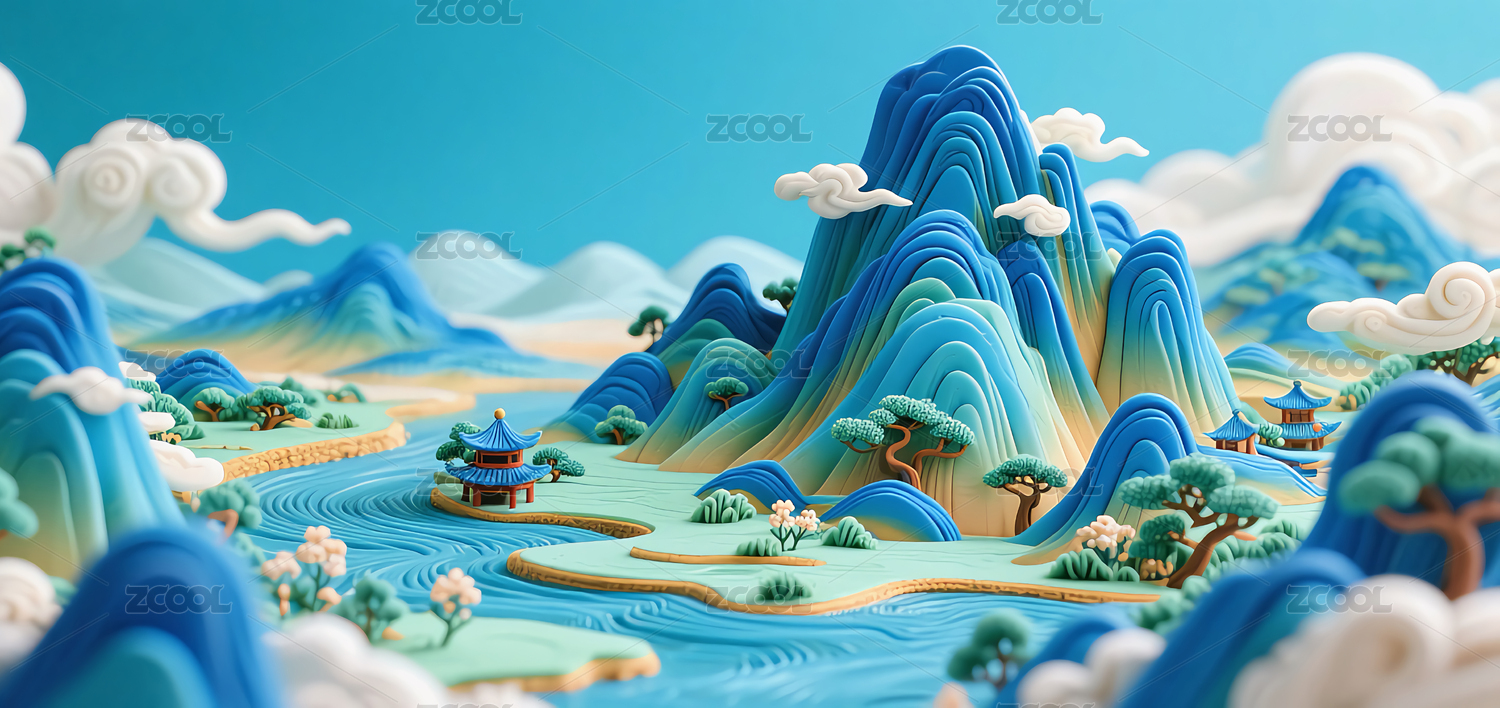 有亭台楼阁小桥流水的仙境绿色山水3D卡通
