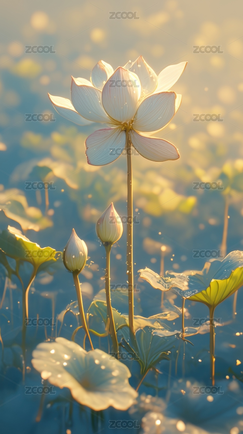 金色勾线的荷花荷叶上飞来一只蜻蜓