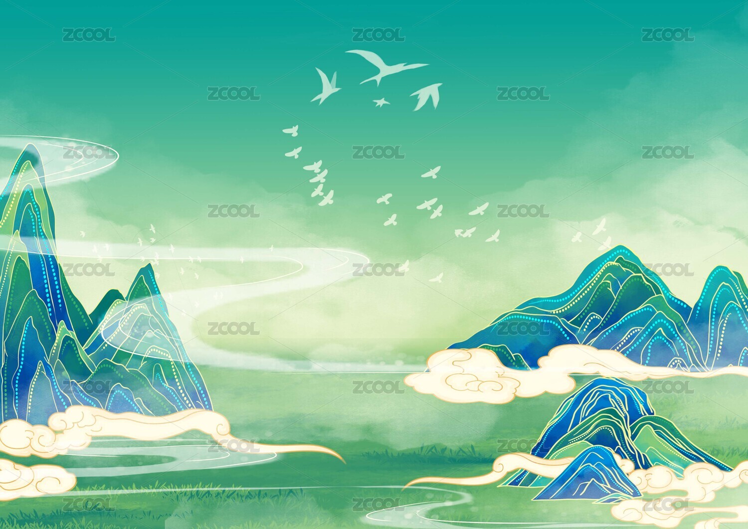 山水,云朵,飞鸟,风景,自然,插画,背景,宁静,山水画,手绘