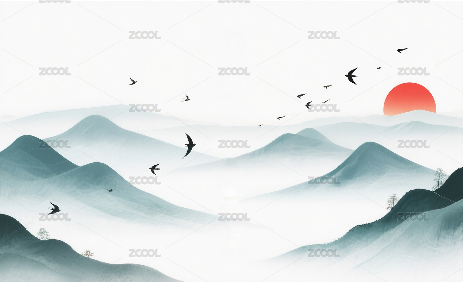 山水云雾飞鸟插画