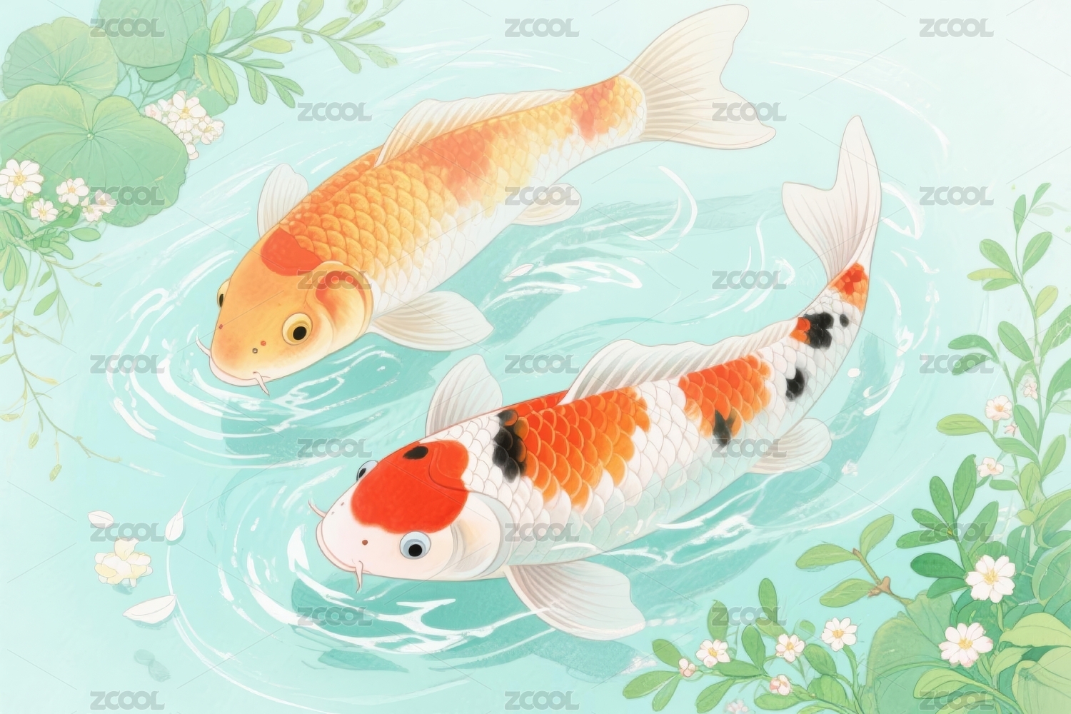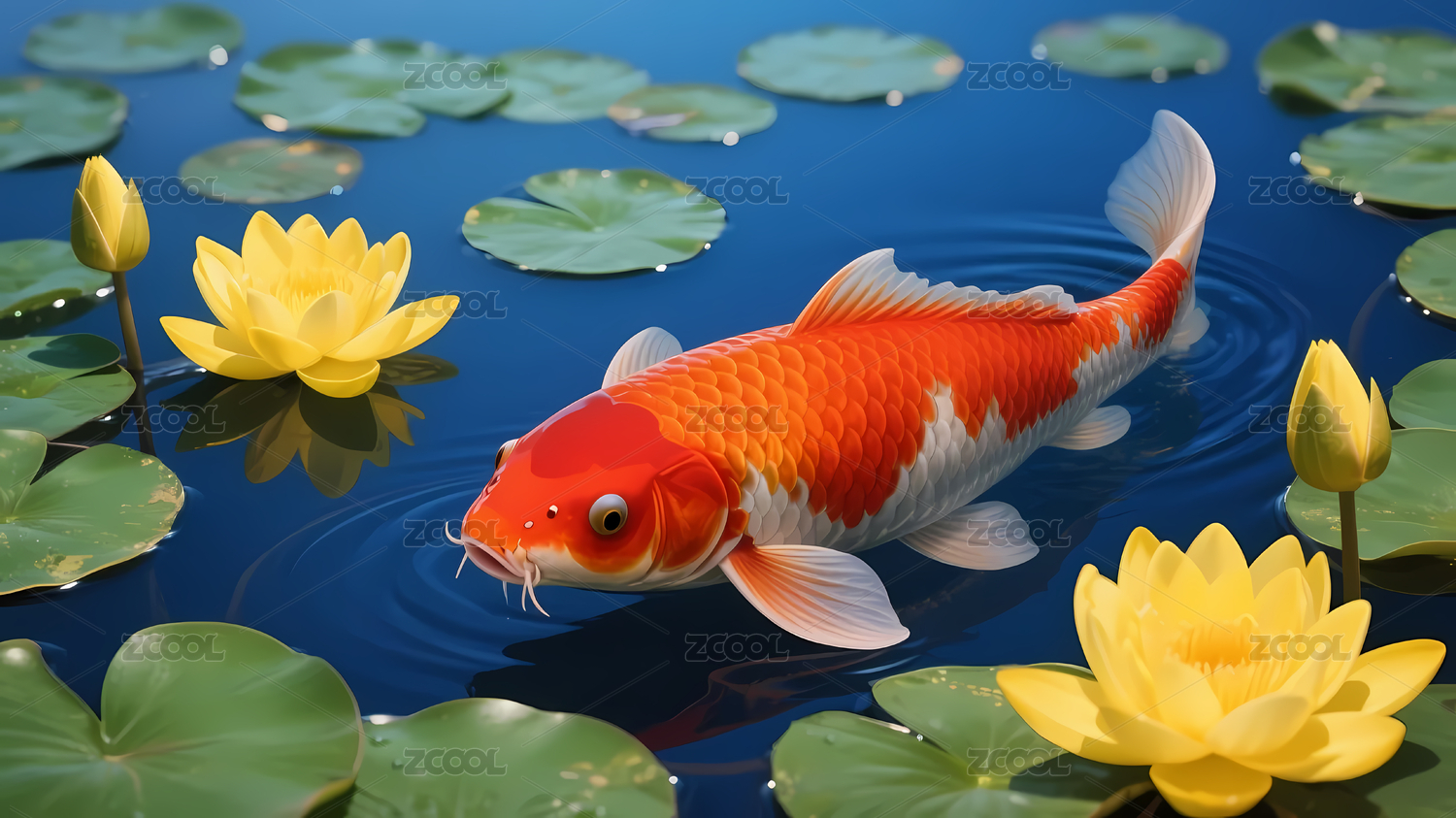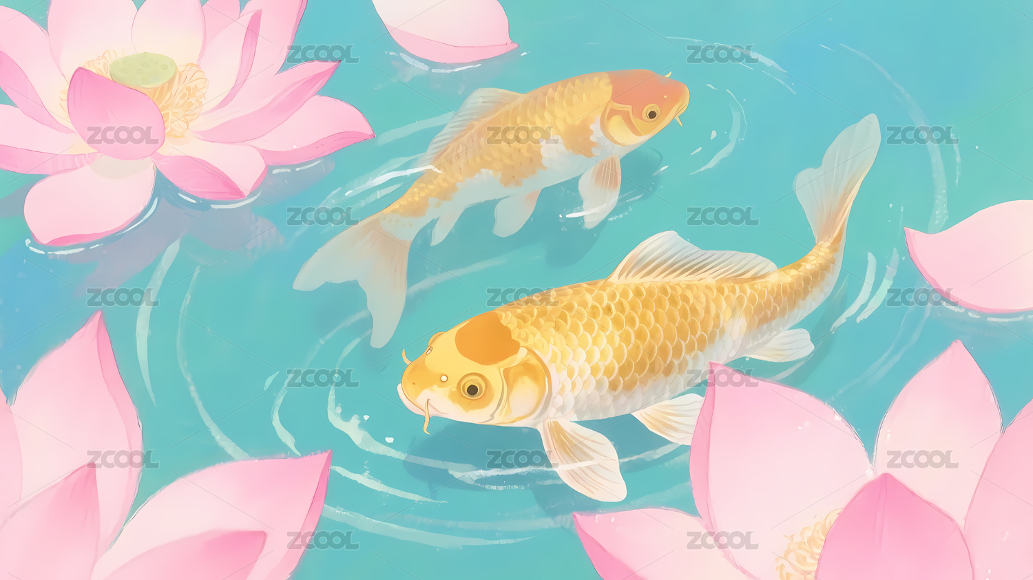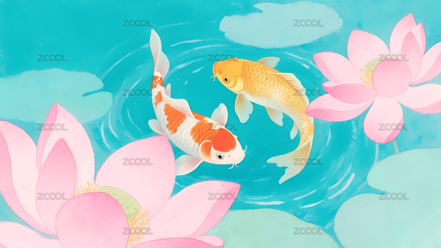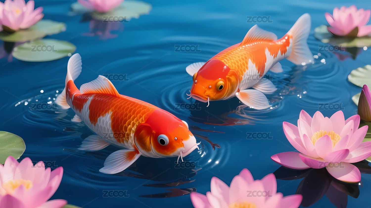 蓝色,白色,背景,橙色,锦鲤,水面,荷叶,自然,清新,荷花