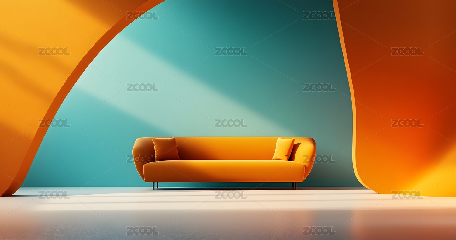 现代客厅黄色沙发与橙色墙面