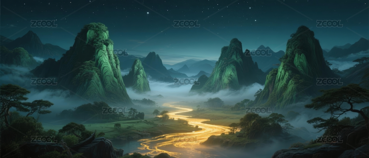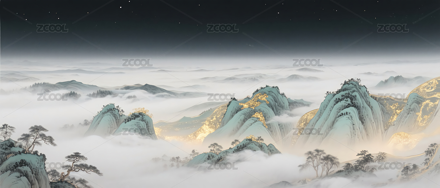 水墨画,国潮,风景,高山,树木,植物,云雾,古风,写意,天空
