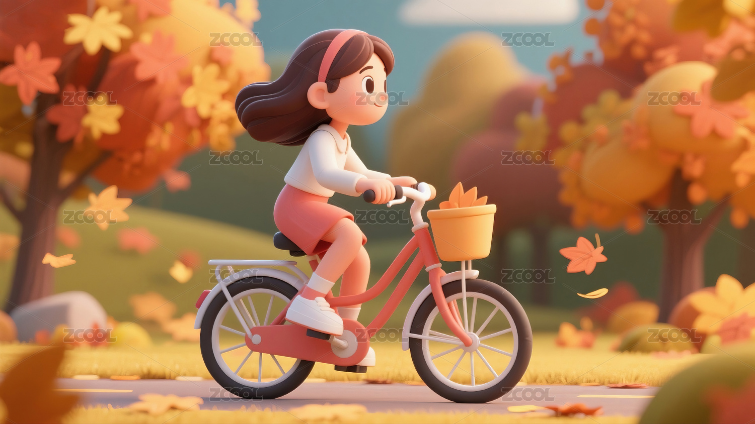 3D卡通女孩在公园骑自行车