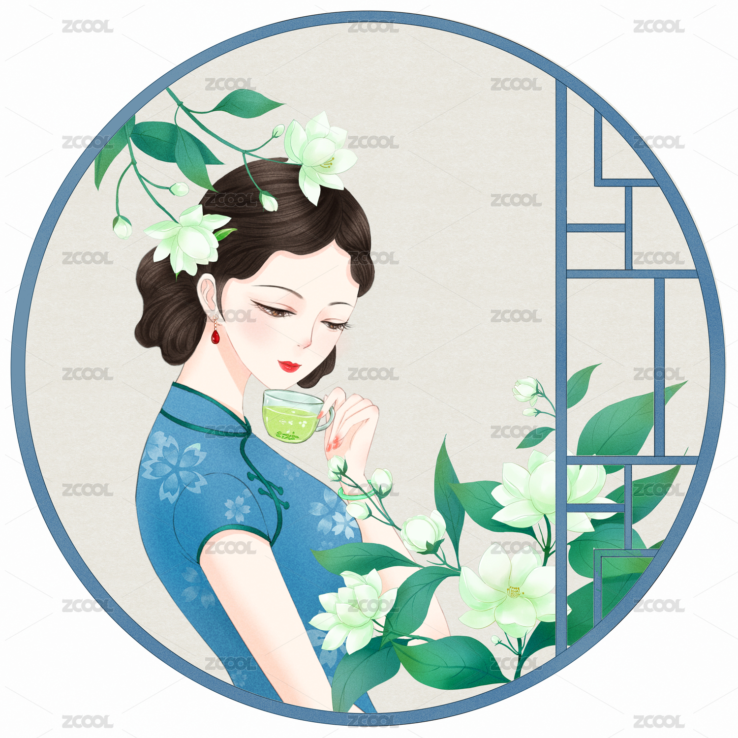 一位穿着旗袍的女性在喝茶国风水彩插画