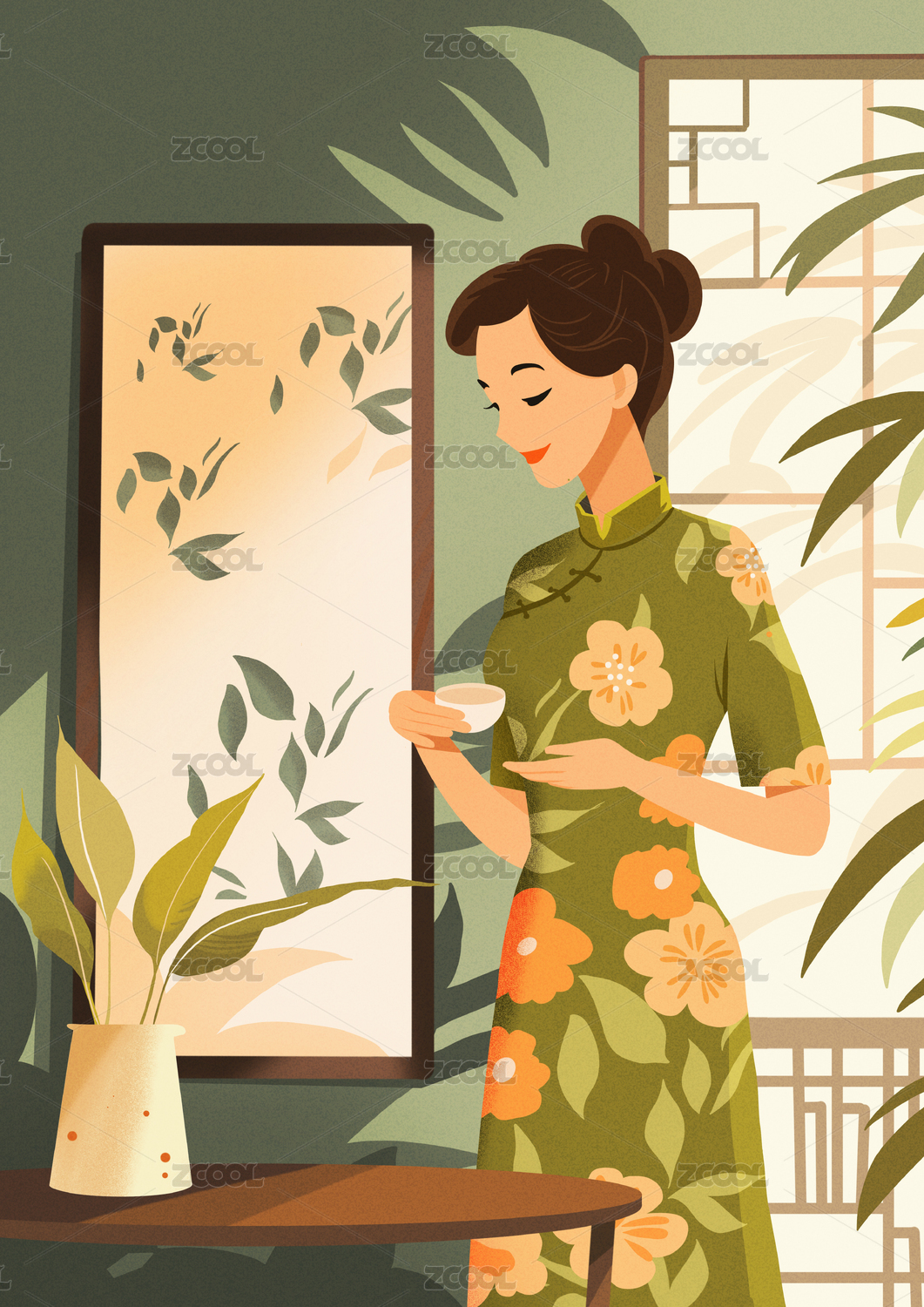旗袍女性喝茶优雅人物国潮国风水墨插画