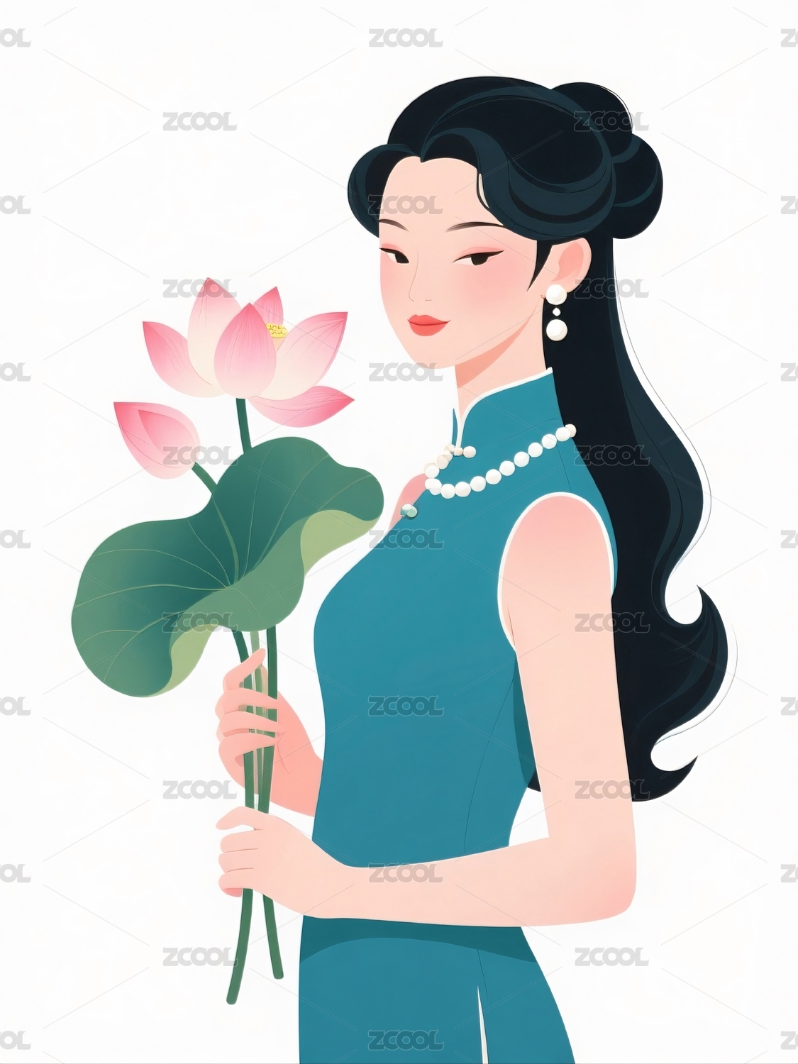 珍珠,优雅,人物,气质,风格,背景,唯美,精致,插画,绿色