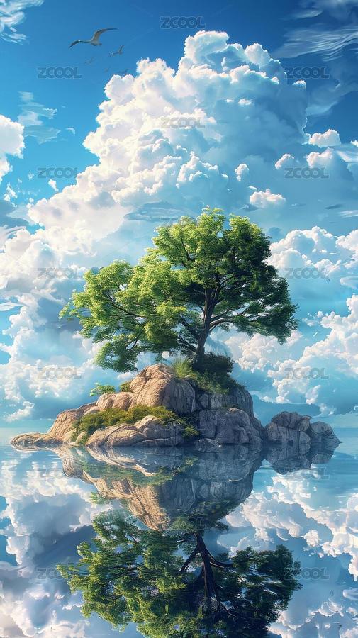 艺术,色彩,美丽,倒影,小岛,树木,云朵,天空,自然,风景