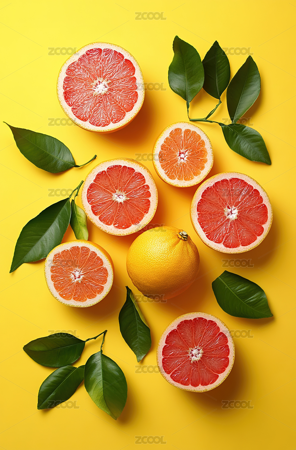 新鲜的葡萄柚和柠檬切片摆放在米色背景上