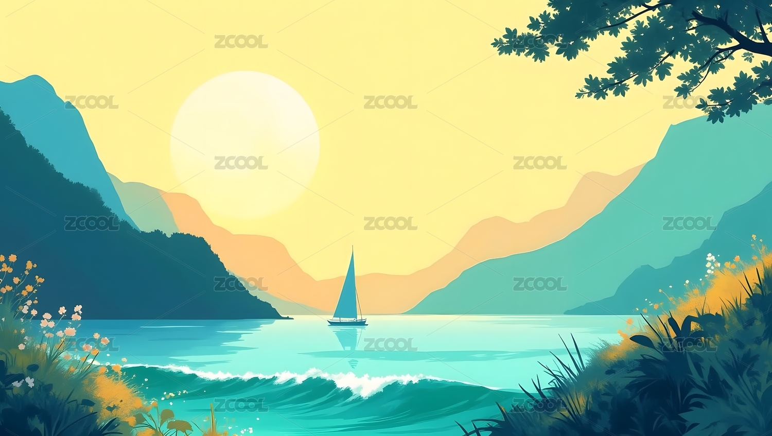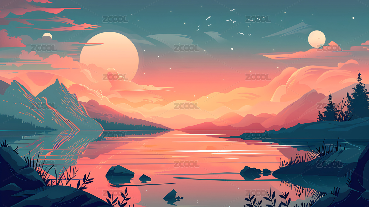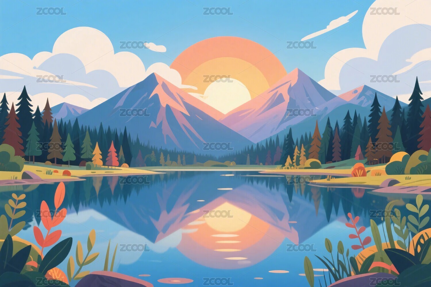 树木,夏季,天空,插画,设计,艺术,图形,自然,数字,夕阳