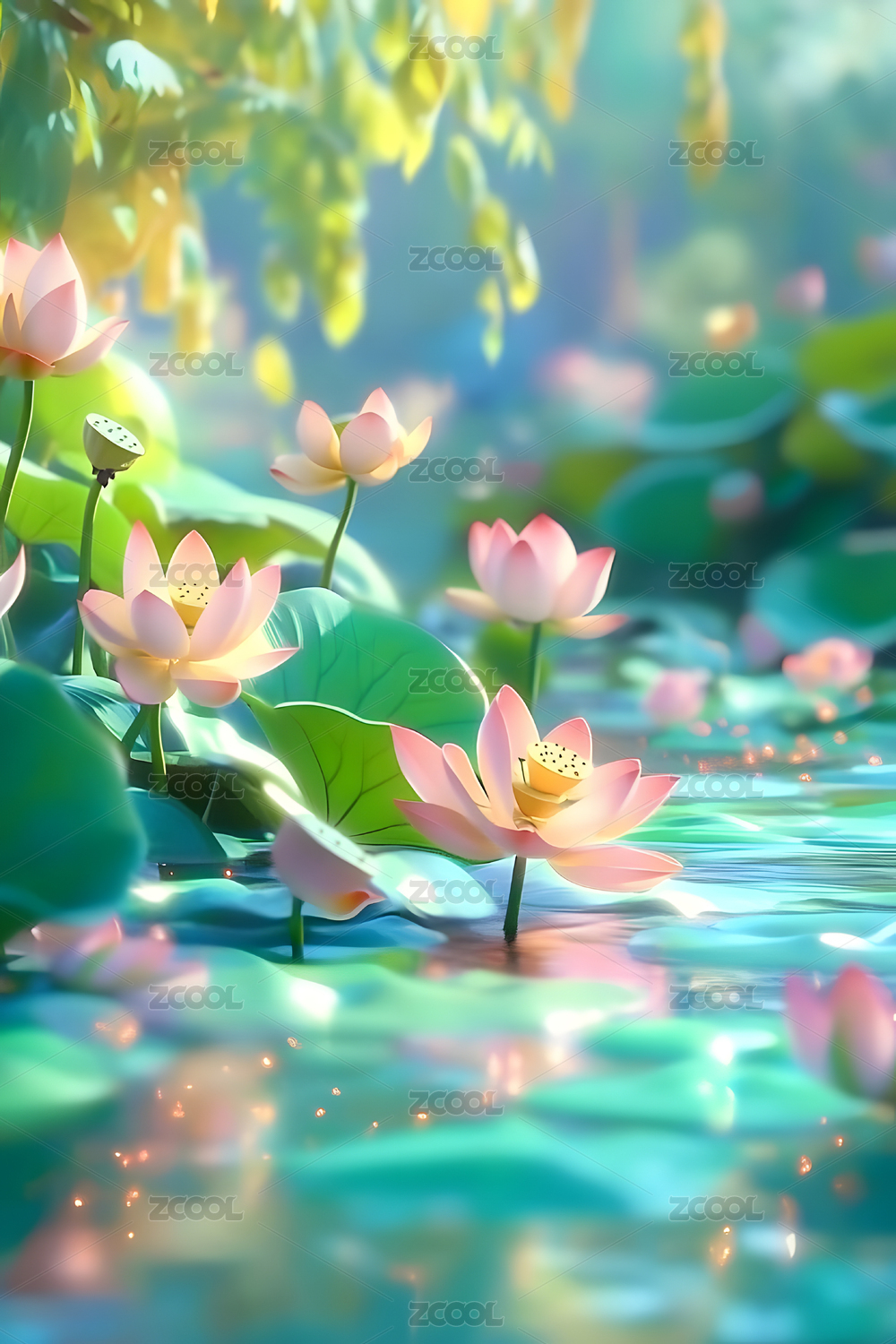 夏至荷塘盛开荷花与碧绿荷叶手绘插画