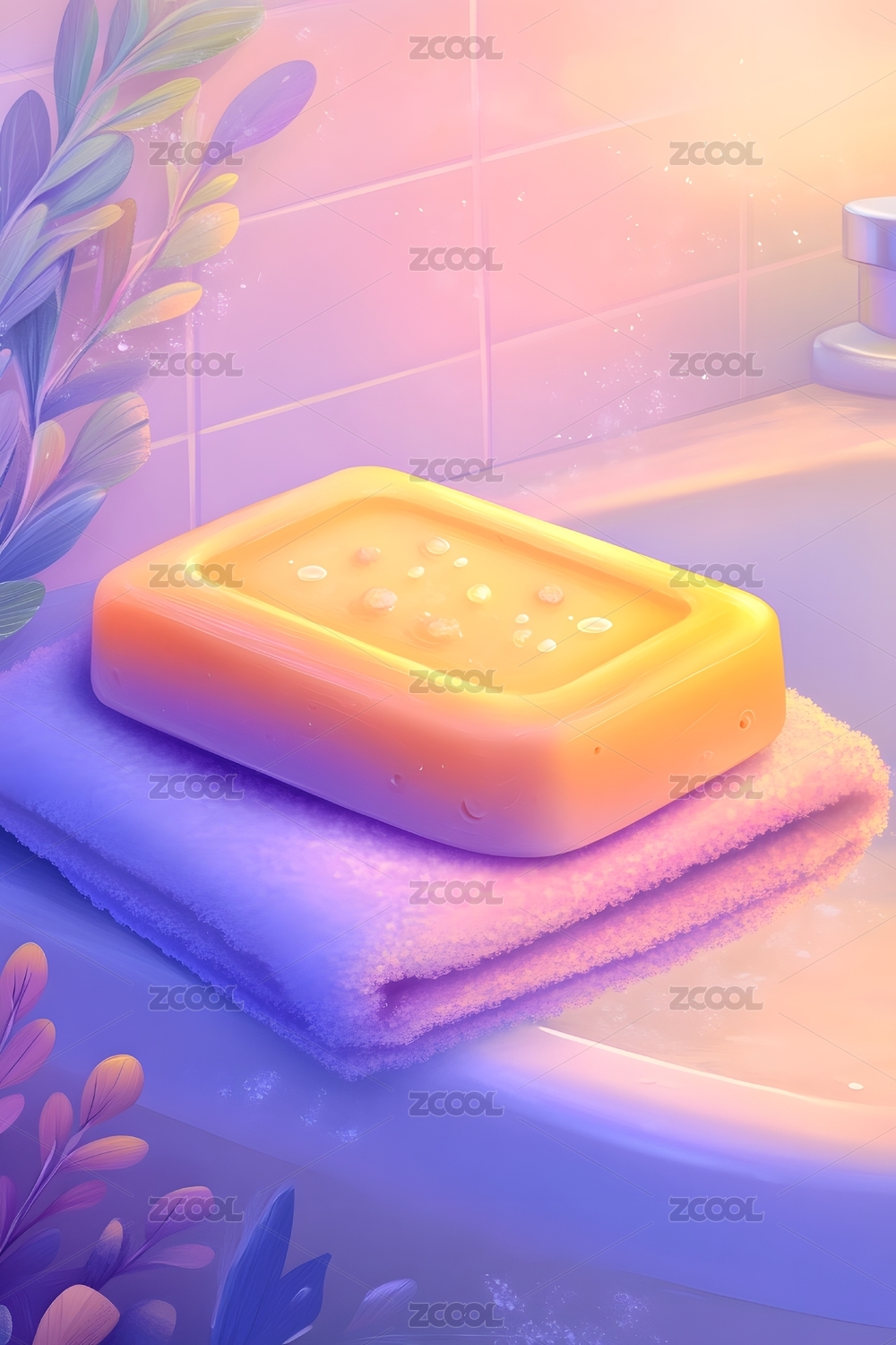 窗边堆叠毛巾上放香皂的温馨静物素材