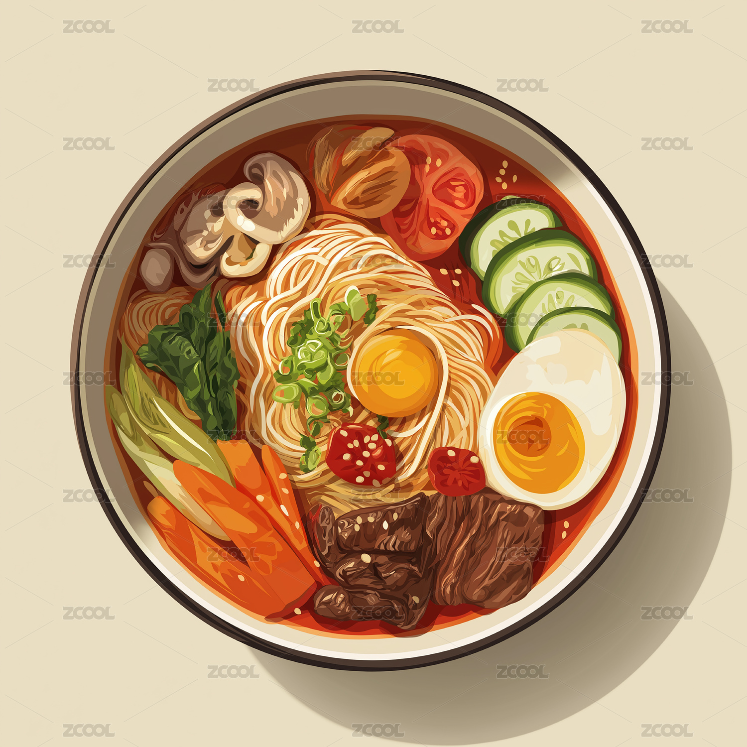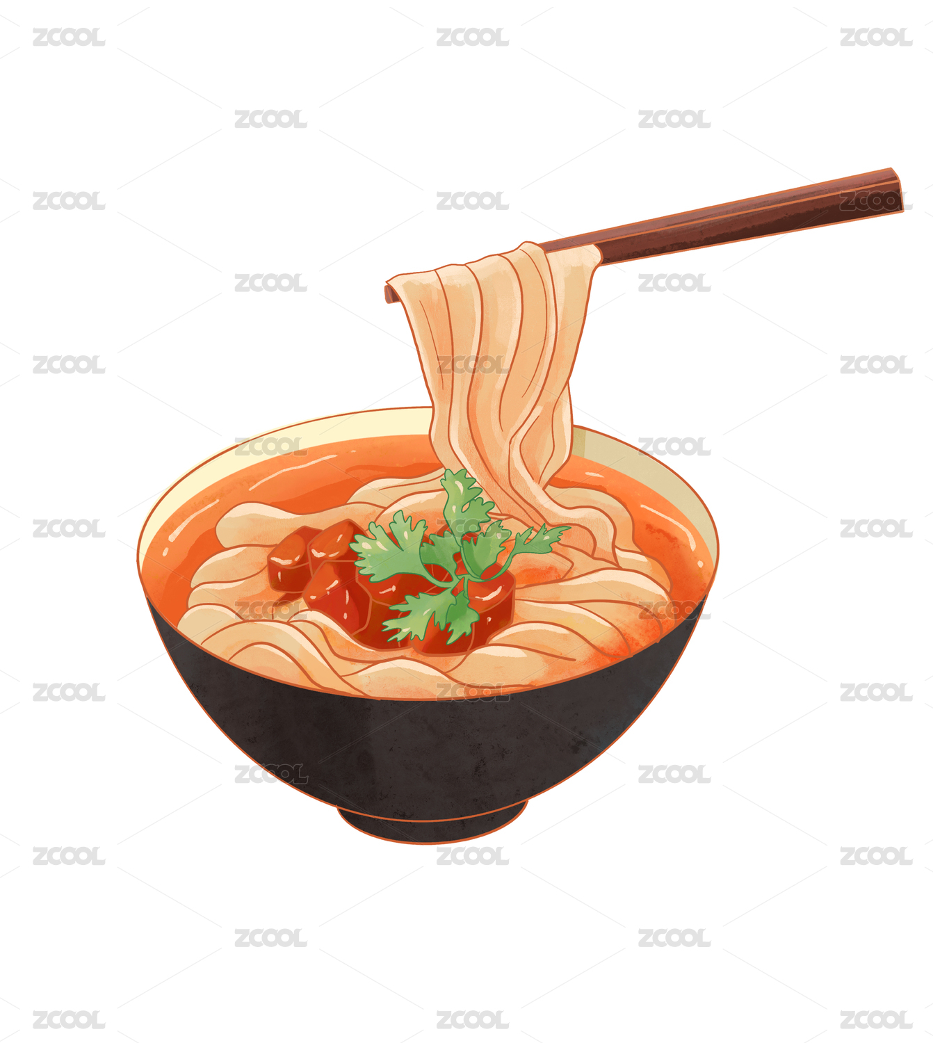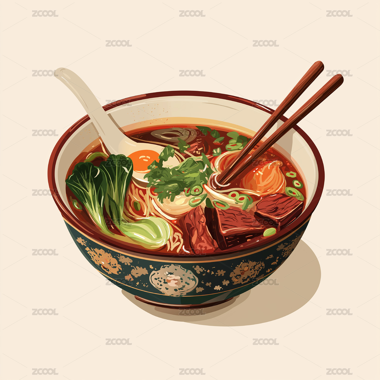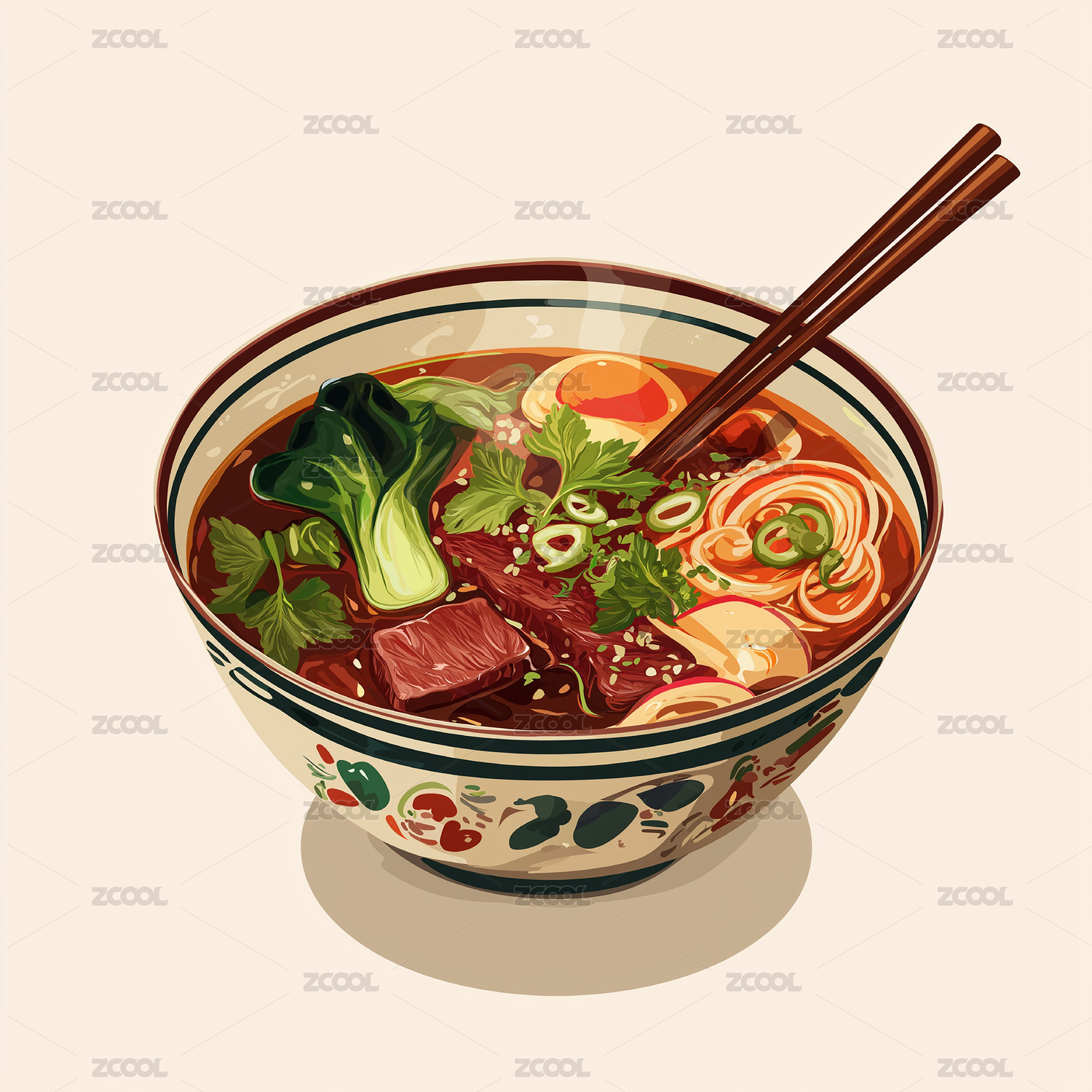 传统花纹碗装蔬菜牛肉汤面插画图案