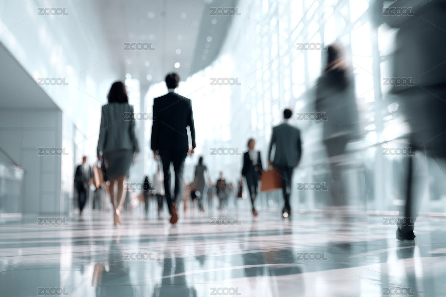 光影玻璃墙下商务人士行走呈现都市动感的艺