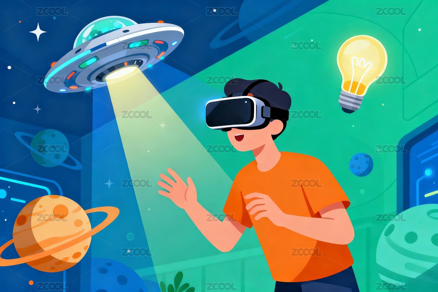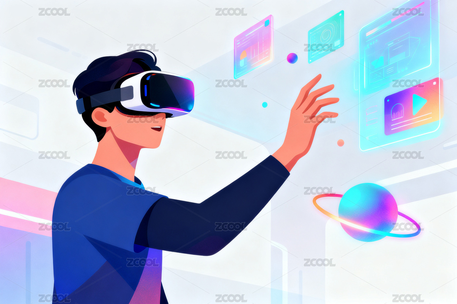 戴着VR眼镜的青年在虚拟几何空间漫游插画