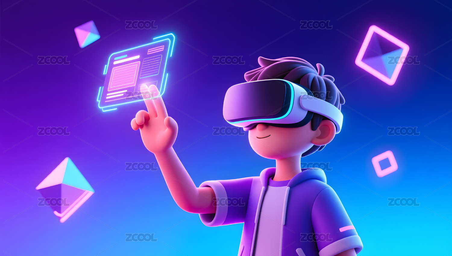 男子室内带科幻全息vr眼镜的3d卡通插画