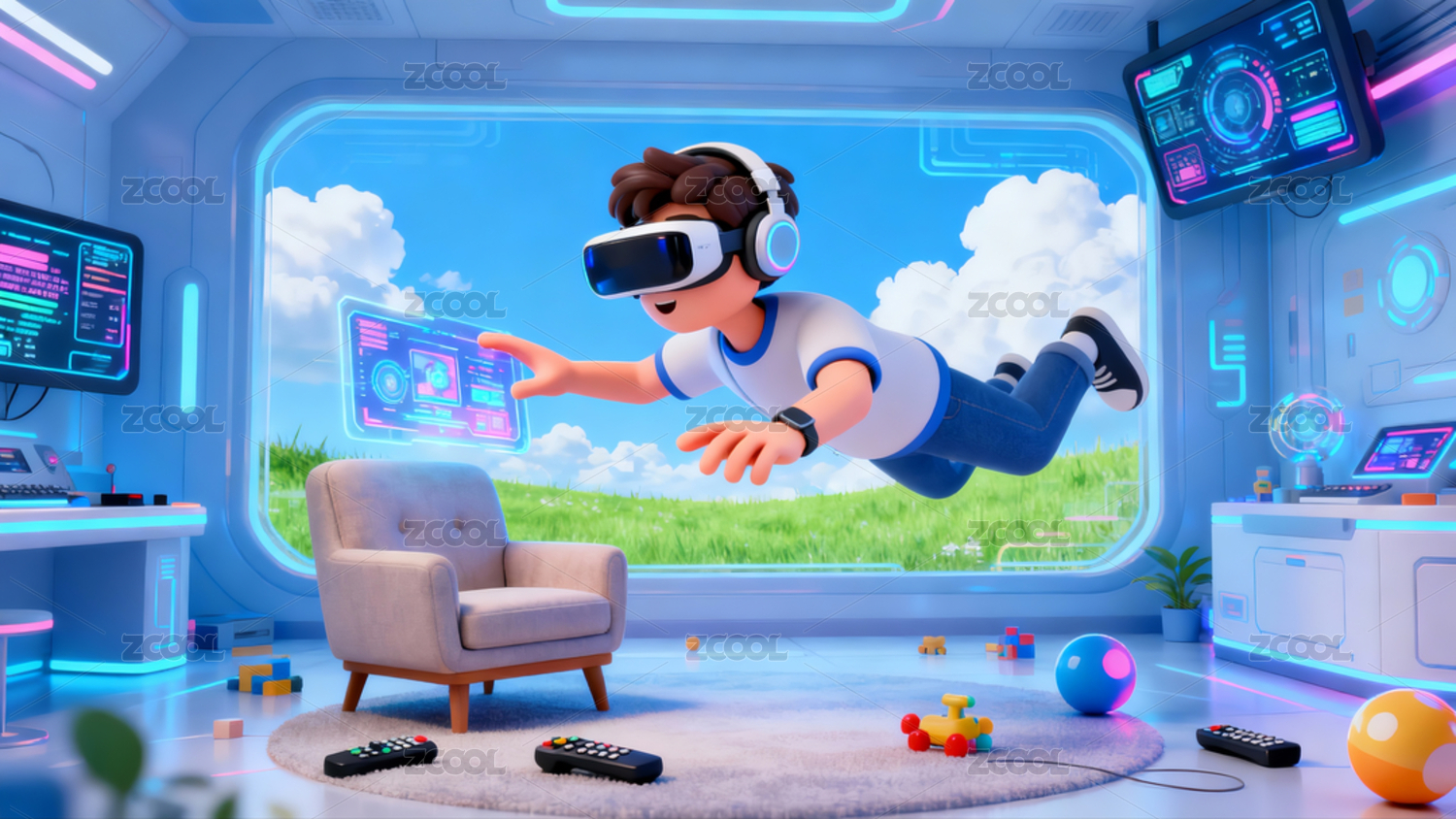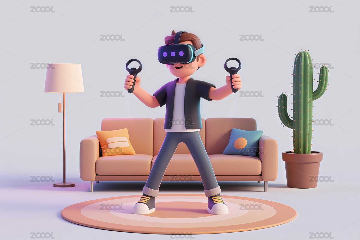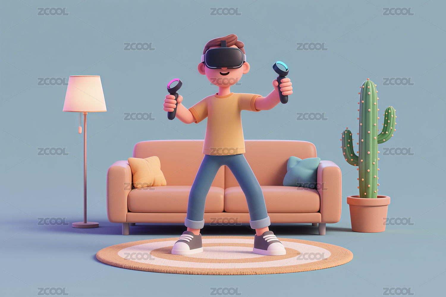 3D动画,人物,虚拟现实,台灯,地毯,室内场景,沙发,游戏手柄,仙人掌,VR
