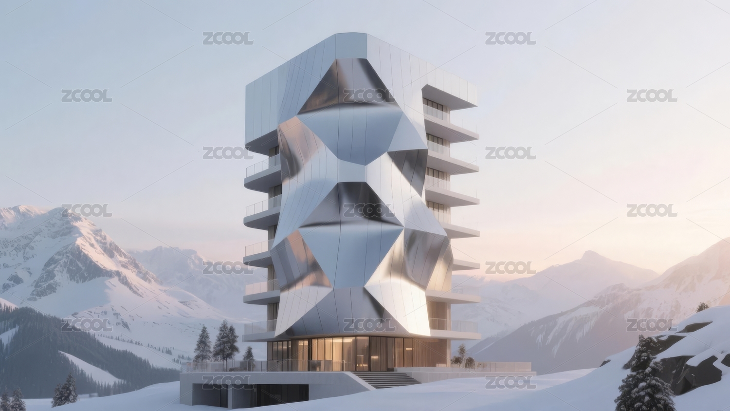 未来感,现代建筑,几何设计,山间环境,玻璃幕墙,独特造型,自然景观,户外场景,艺术风格,建筑外观