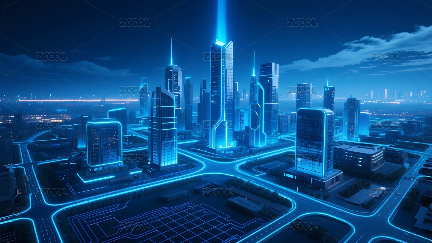 未来城市的夜景霓虹灯勾勒的摩天大楼
