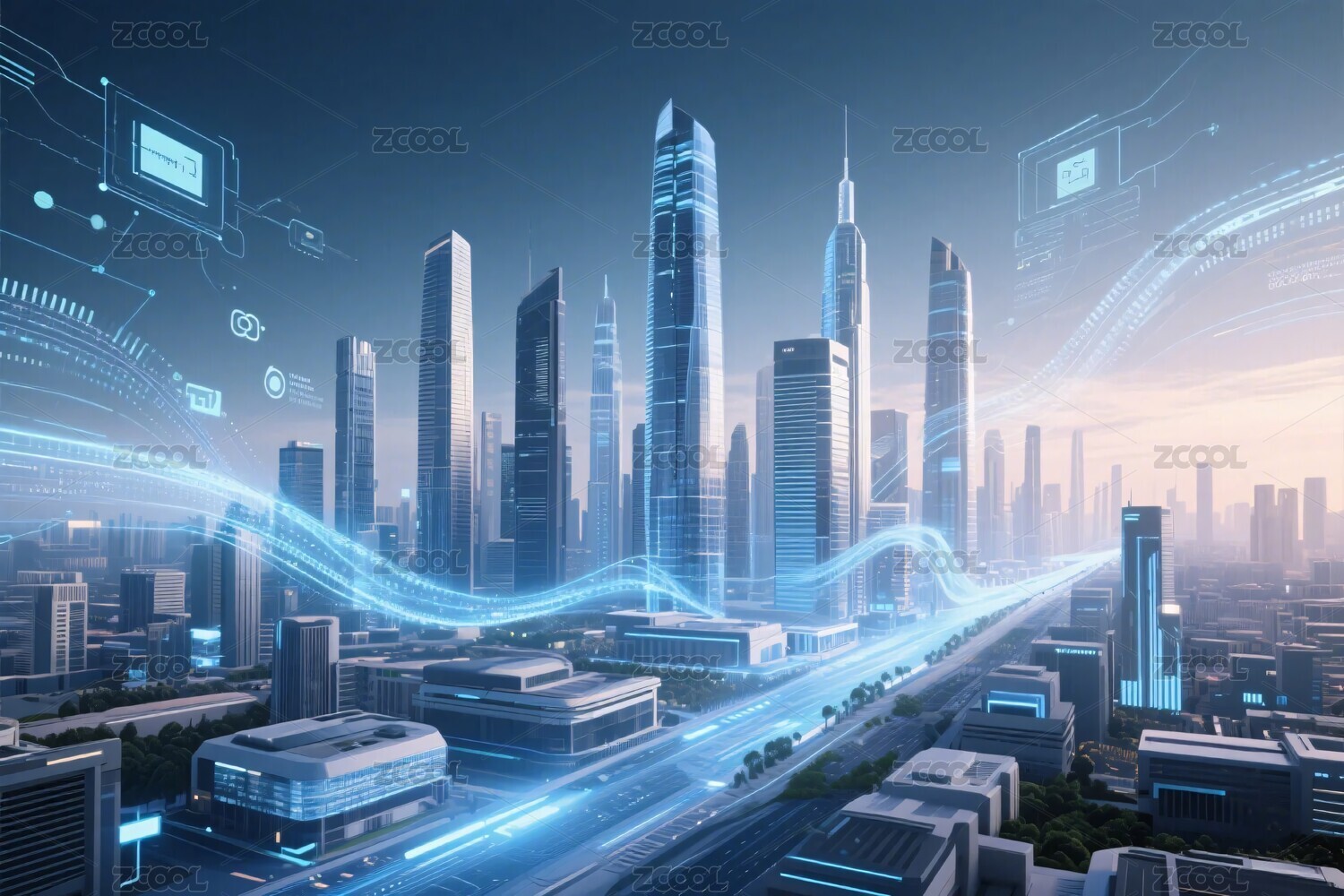 抽象数据流线条发光未来城市轮廓蓝紫色渐变