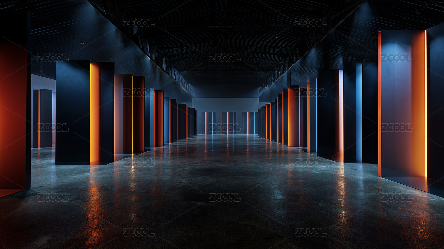 展览,空间,沉浸,面板,哑光,黑色,光线,灯带,垂直,橙色