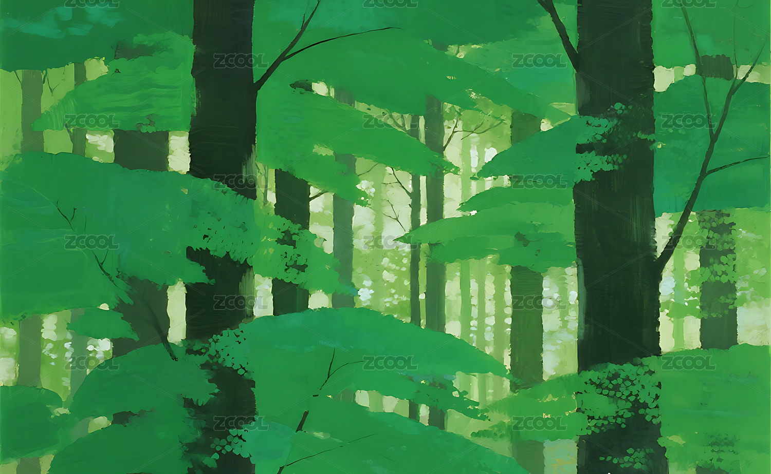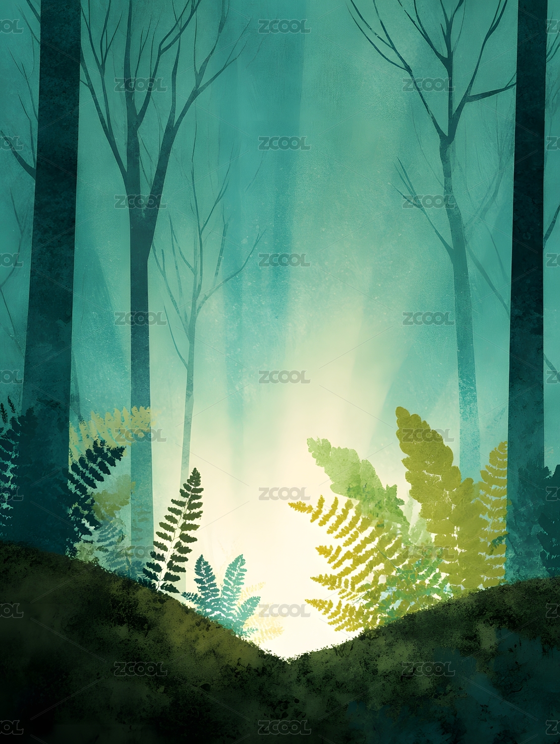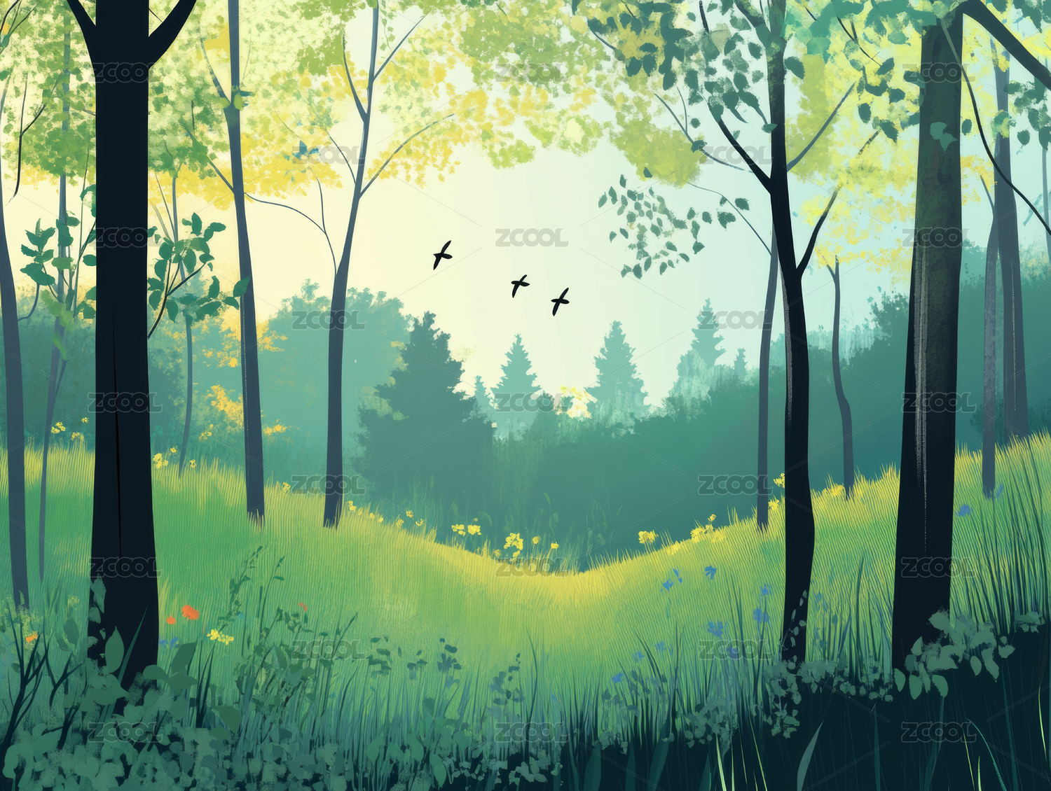 绿色的树林和花草,儿童绘本,卡通风景插画