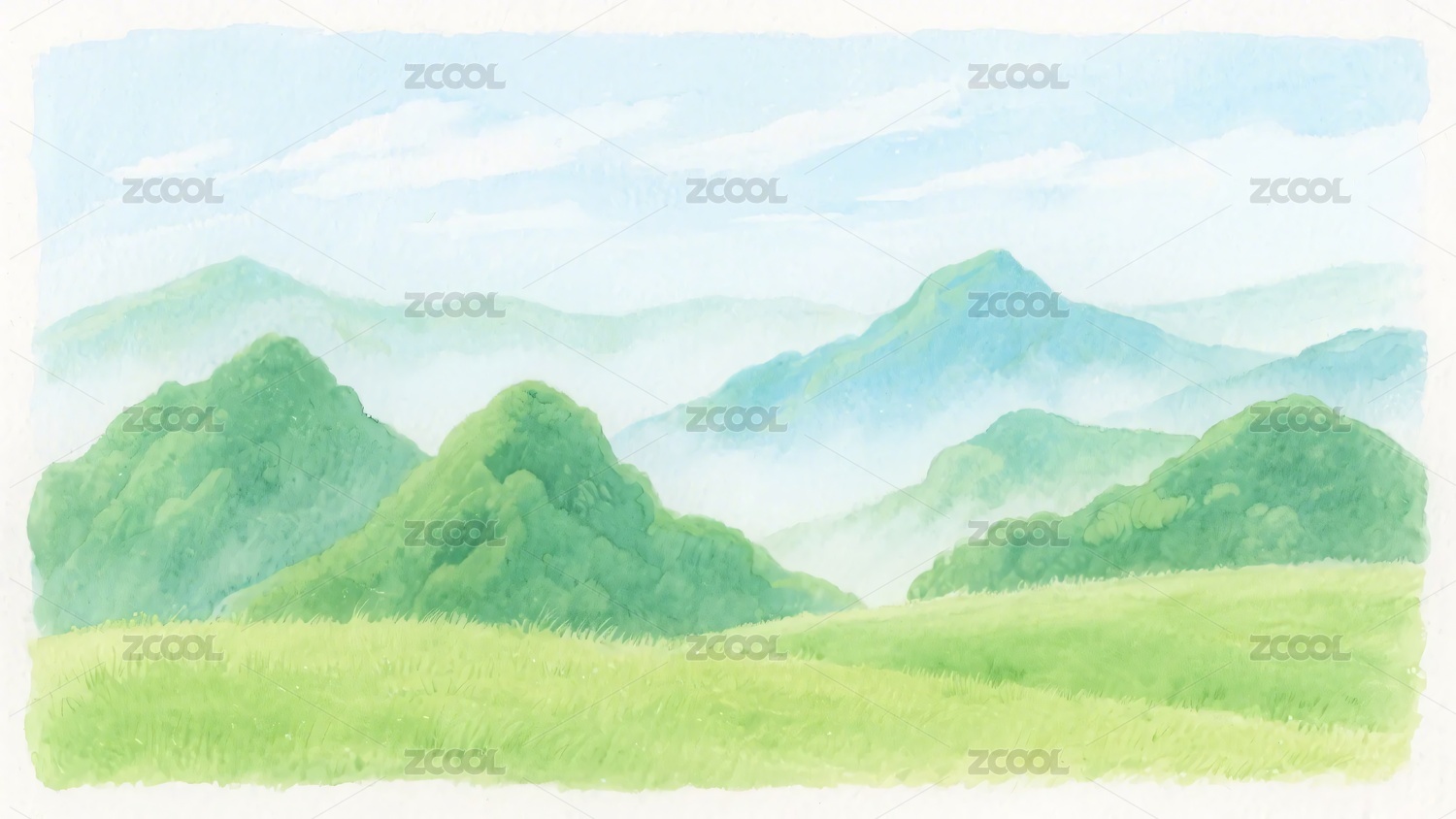 水彩绘就的山峦与草地风景